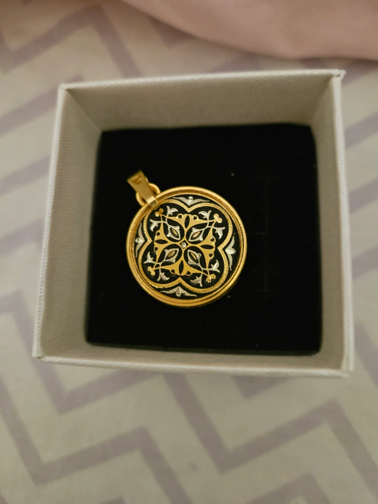 Circular pendant. no chain Gold coloured metal frame. Intricate gold and silver detailing.
