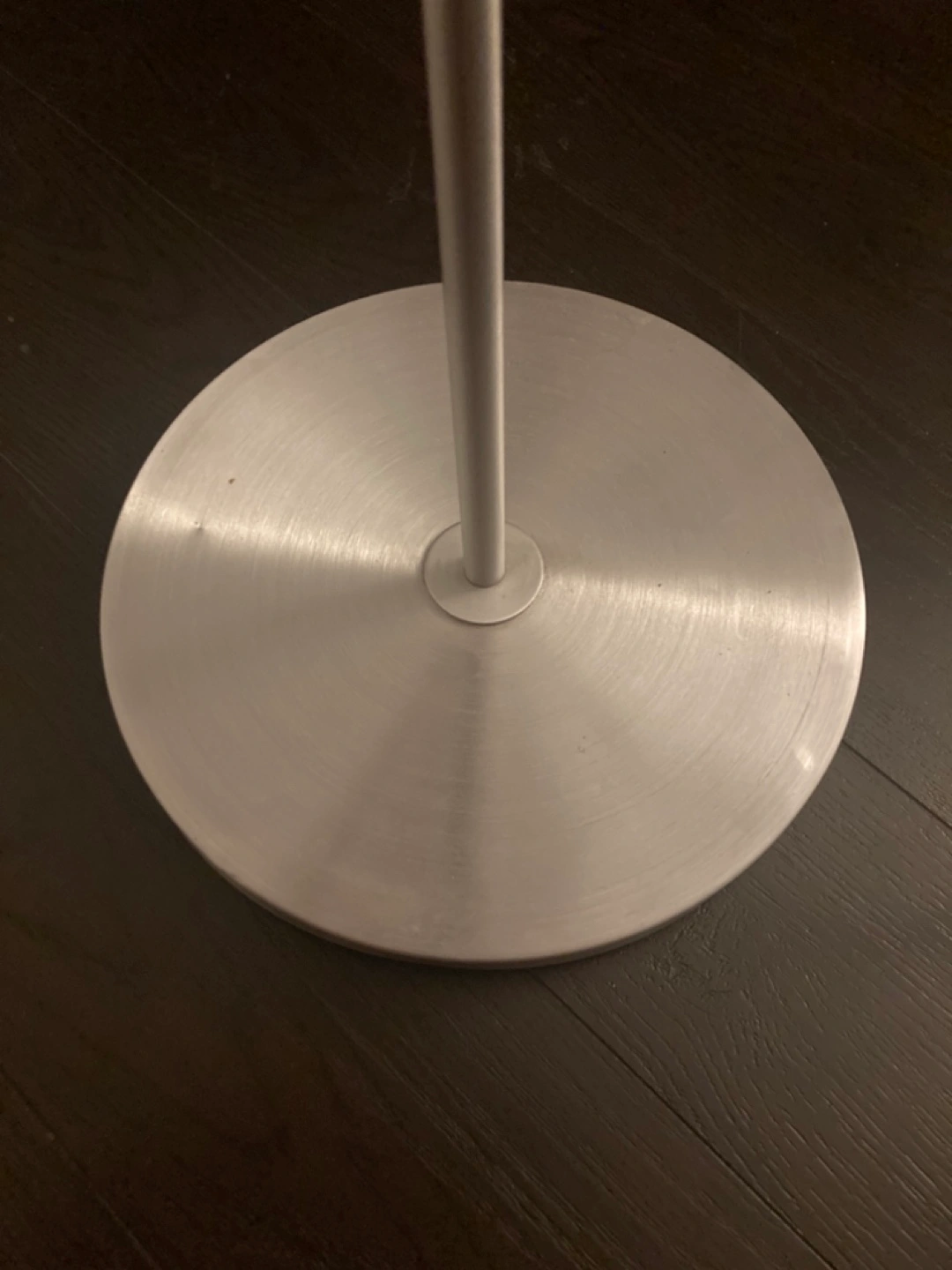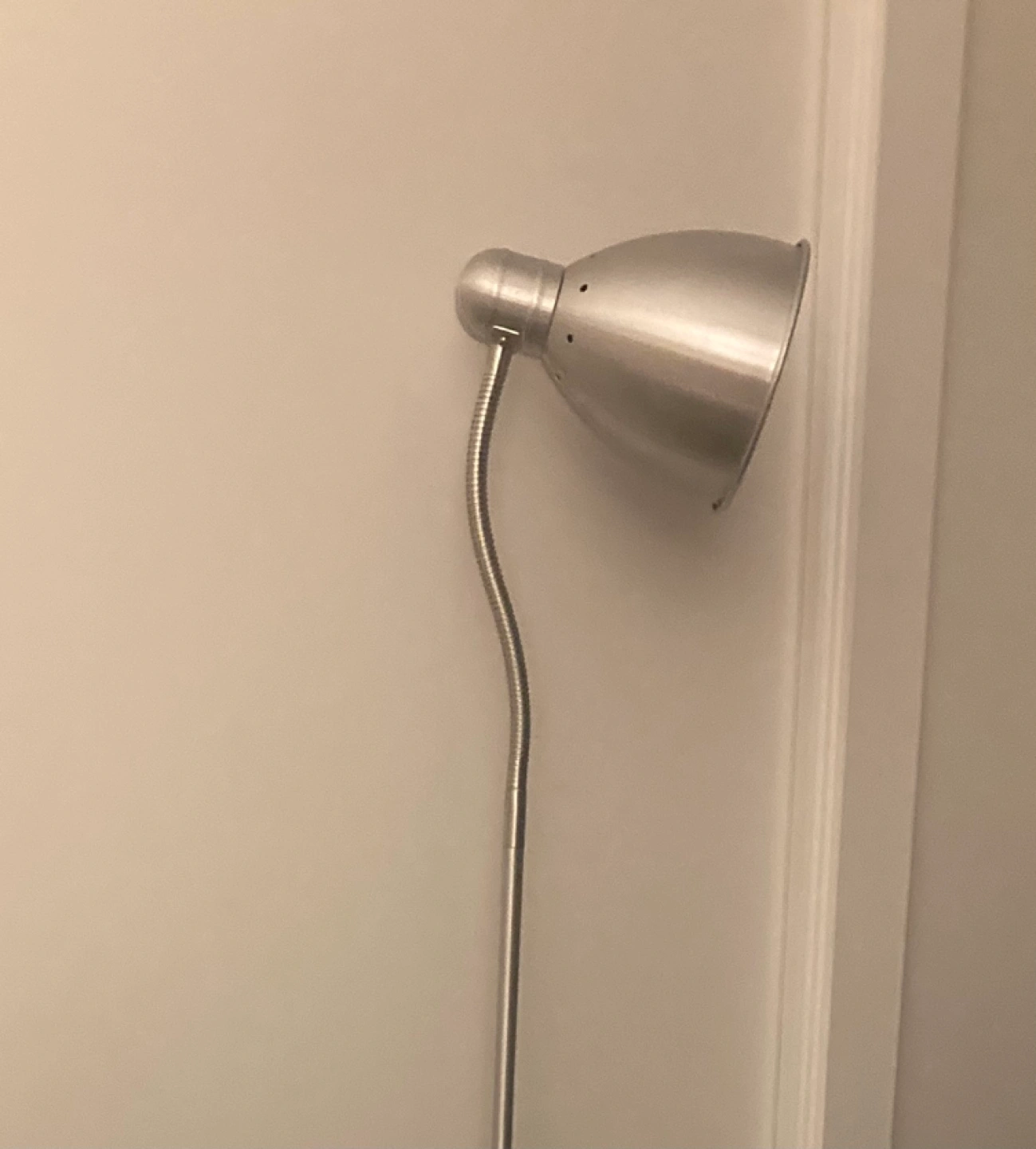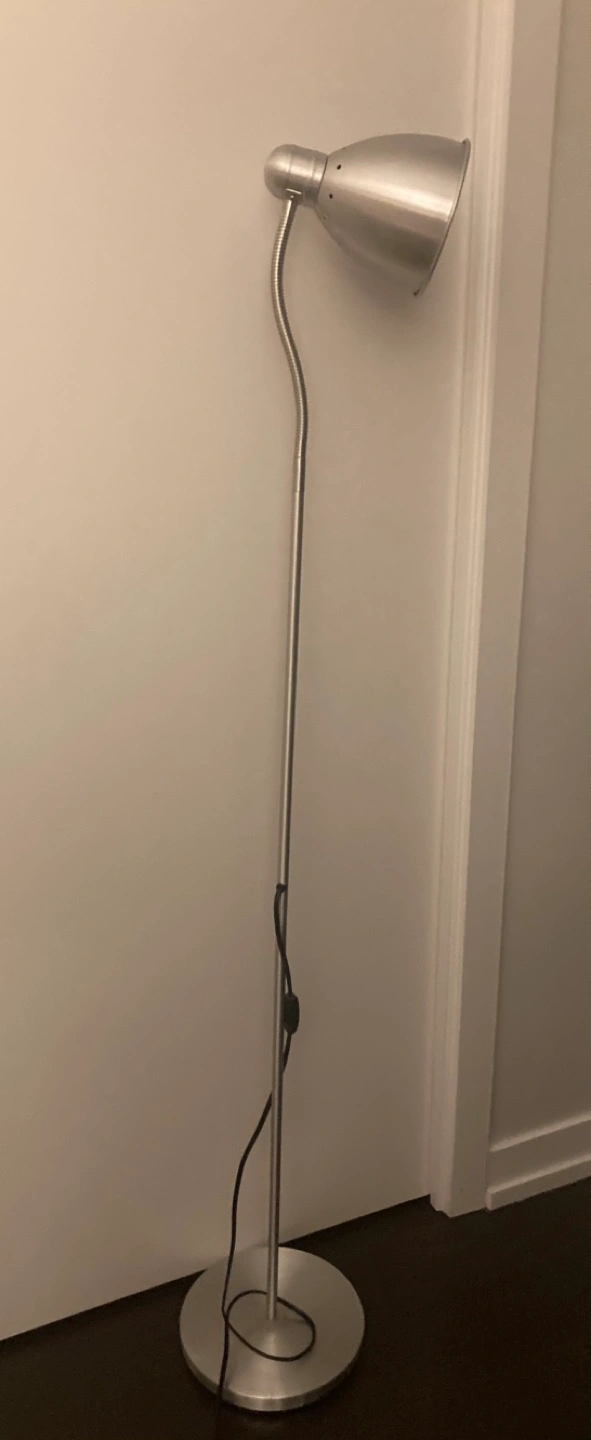Sleek silver floor lamp. Adjustable lamp head. Simple design. Good for reading or task lighting. Incline adjustable.