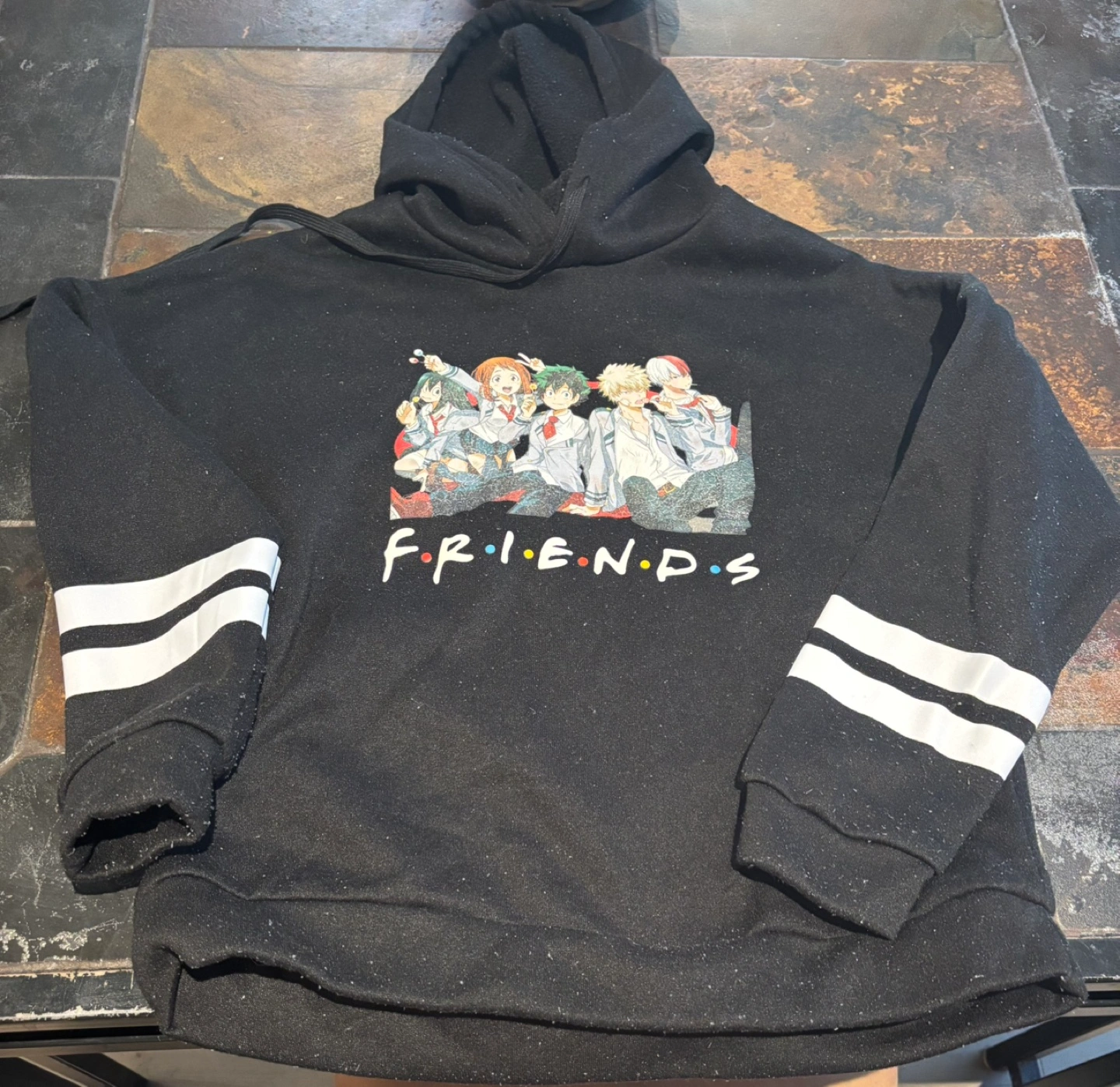 Black anime hoodie. Features My Hero Academia characters and Friends logo. White stripes on sleeves. Hooded.