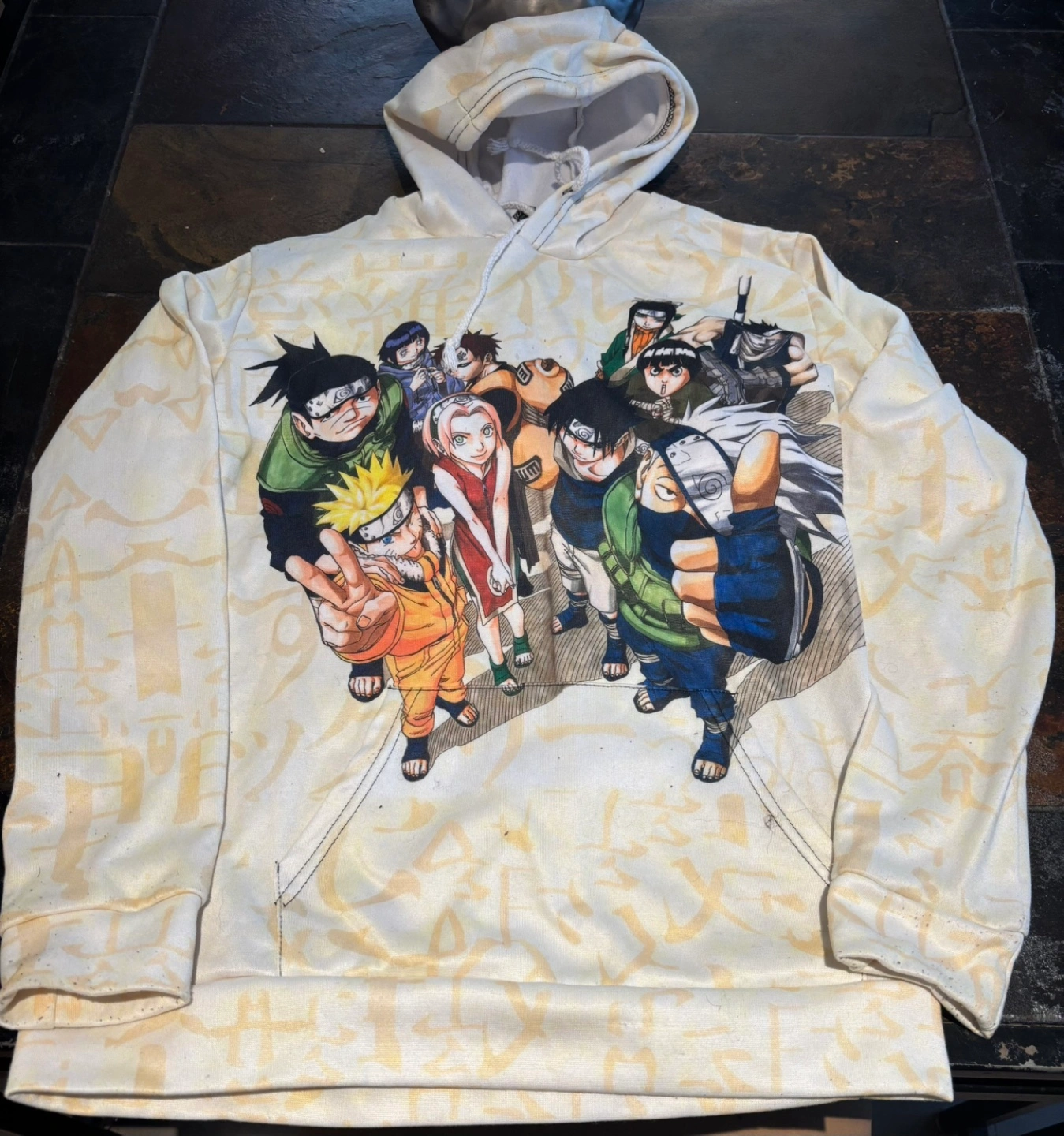 Cream-coloured hoodie featuring a large graphic of Naruto characters. Long sleeves, kangaroo pocket. Adult size.