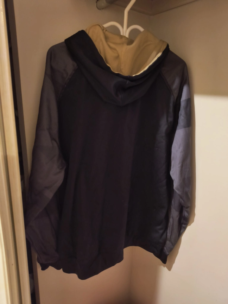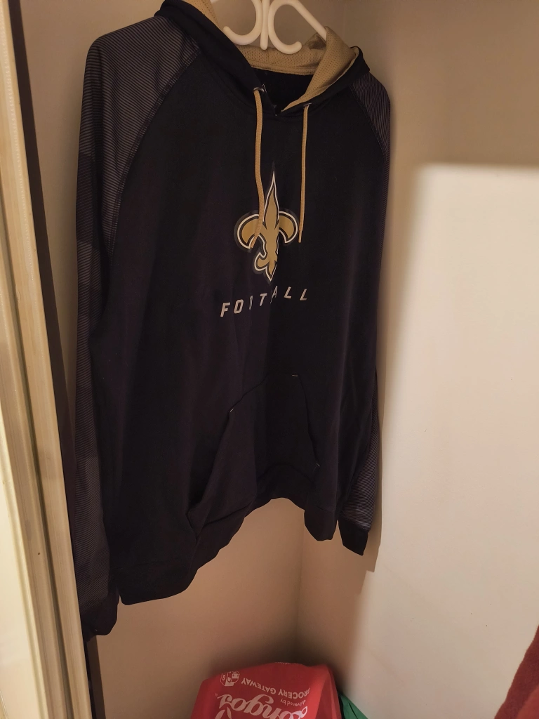 Black and gold New Orleans Saints football hoodie. Features team logo and lettering. Size 2XL. Thermabase technology. Made in Egypt.