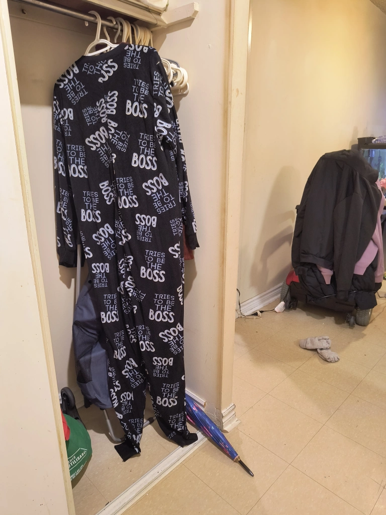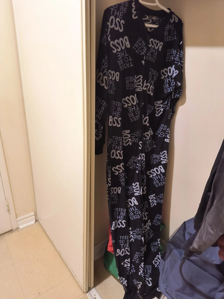 Adult-sized fleece onesie. Black with a repeating "Tries to be the Boss" pattern. Long sleeves and full length.