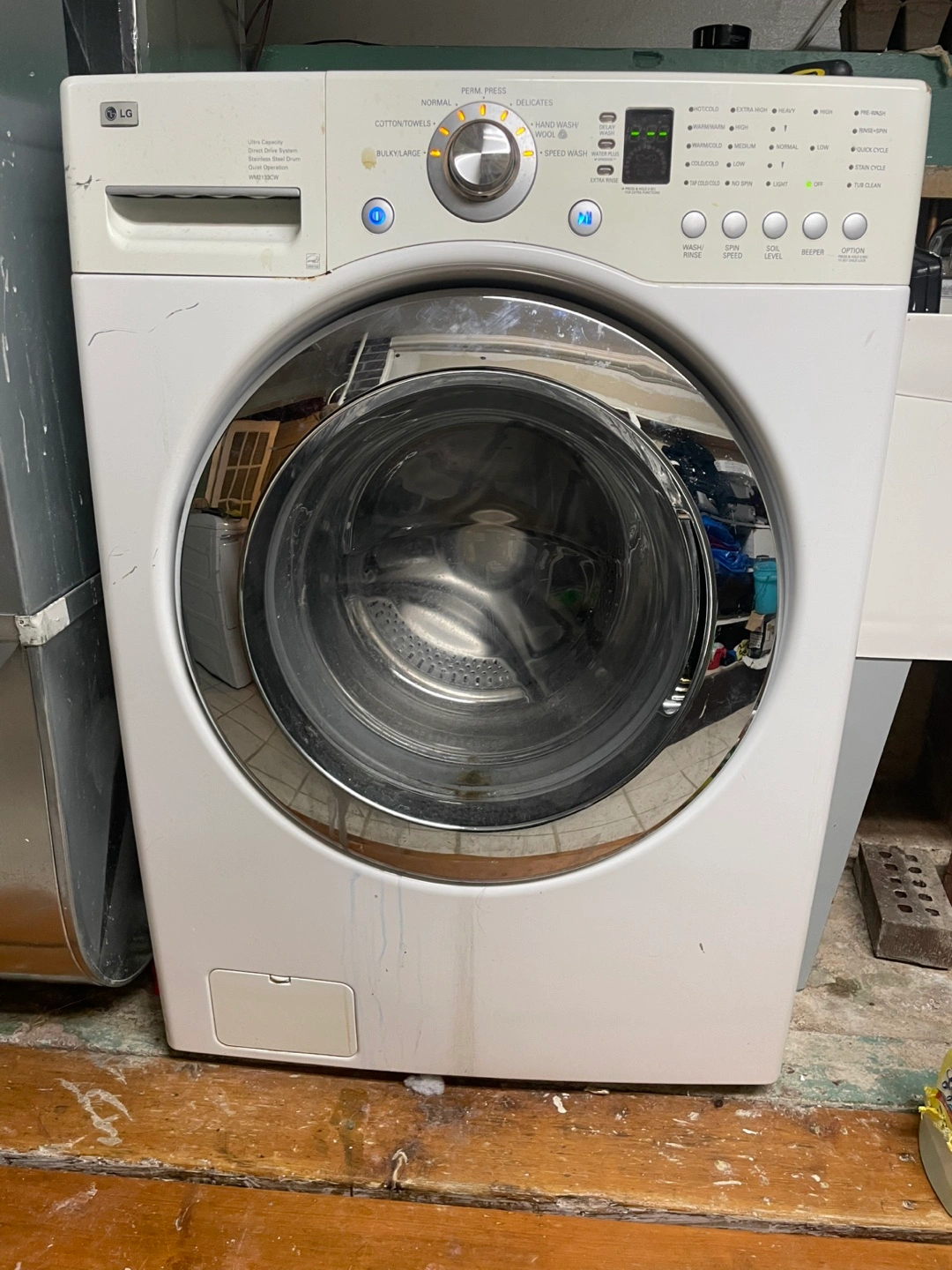 Used LG front-load washing machine. Features various wash cycles, including bulky/large, delicates, and speed wash. White colour. Shows some wear,this machine it was in the house when we move in but we changed for different machines is a old model but still in in working condition