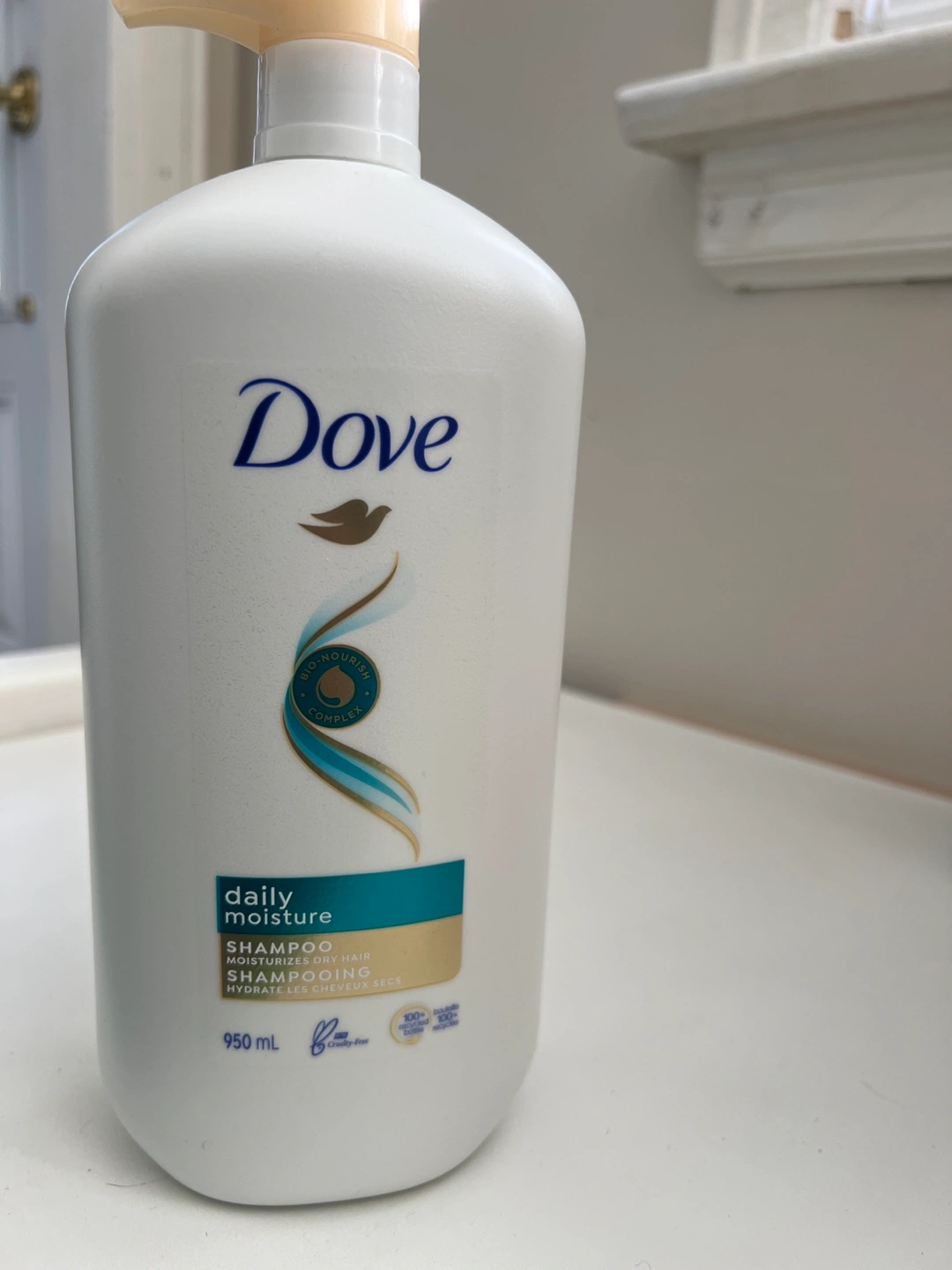 Large 950ml bottle Dove Daily Moisture shampoo. Moisturizes dry hair. Bio-Nourish complex. Cruelty-free. 100% recycled bottle.