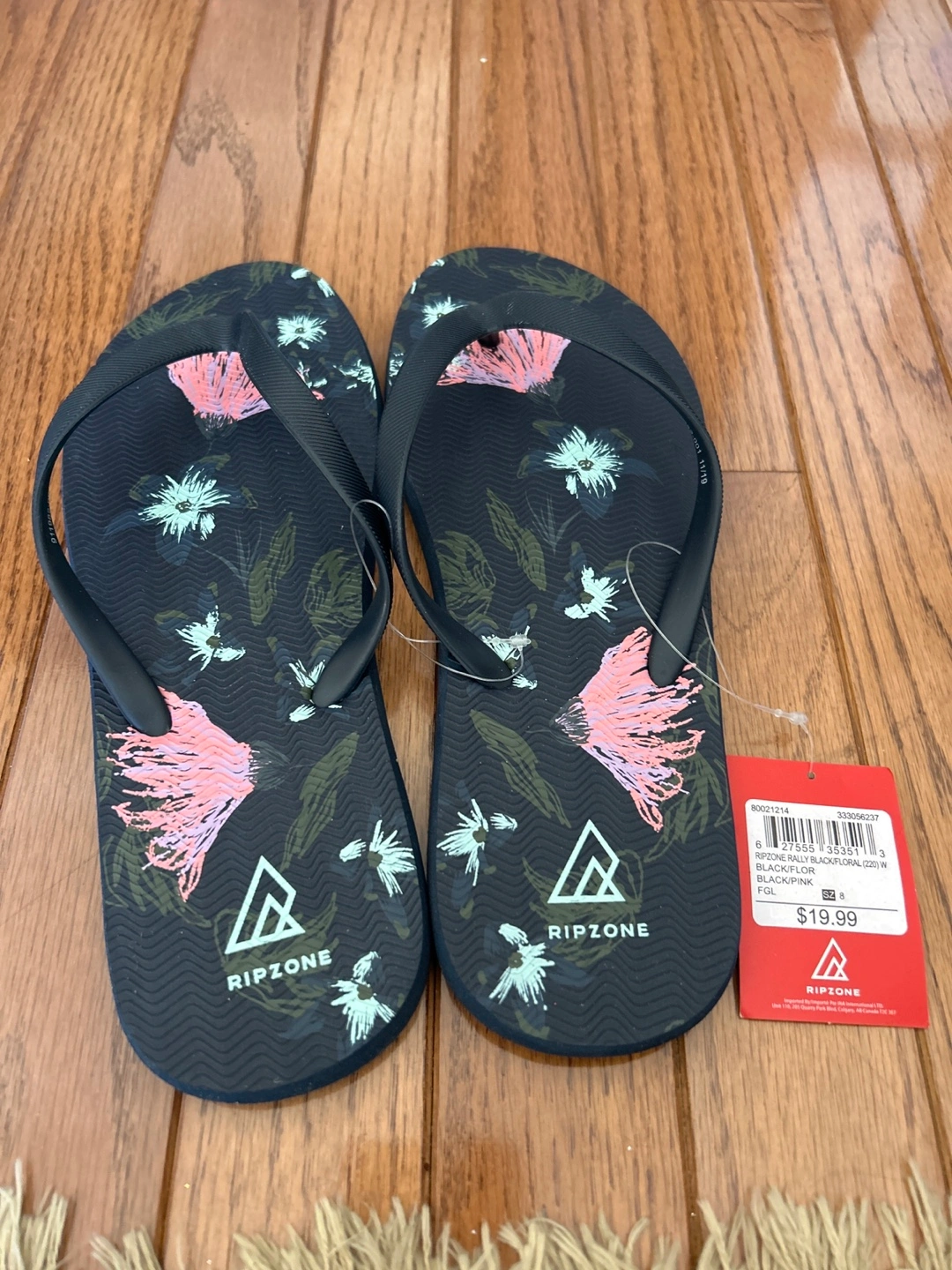 47New women's flip flops. Size 8. Dark blue with floral print. Comfortable and stylish. Perfect for summer.