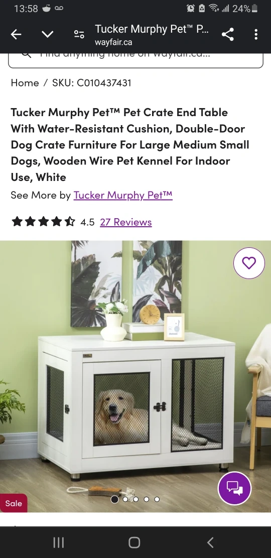 Pet crate end table. Water-resistant cushion. Double-door. Suitable for small, medium, or large dogs. Wooden wire pet kennel for indoor use. Purchased for $375 but my dog does not like it and has not used it unfortunately.