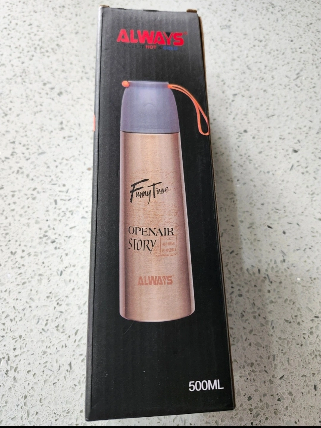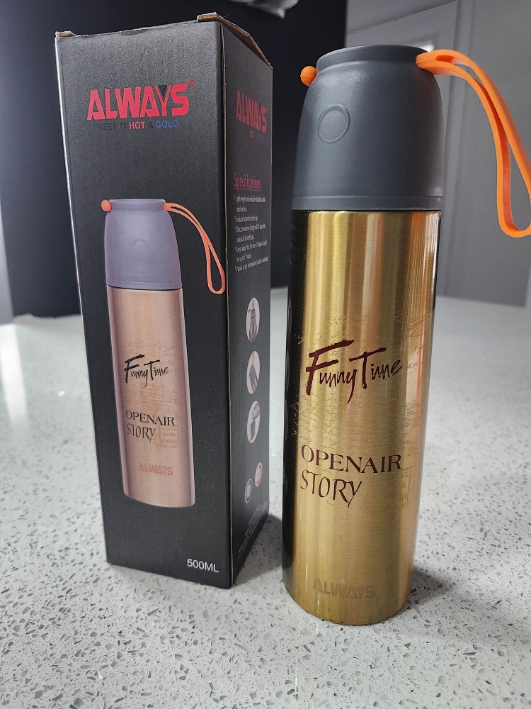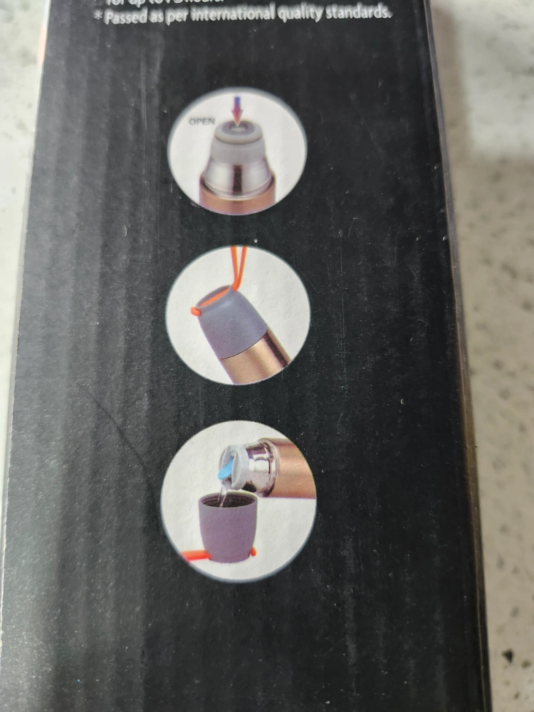 Unbreakable stainless steel construction, insulated stainless steel cup, slim design . The Thermo keeps liquids hot or cold for over 15 hours. Brand new. Vacuum insulated bottle.