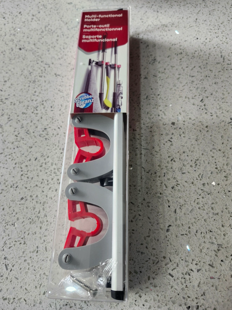 Brand new multi-functional tool holder. Three slots for tools. Includes mounting hardware. Grey and red plastic with aluminum pole.