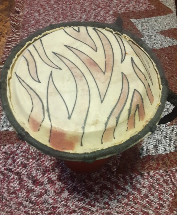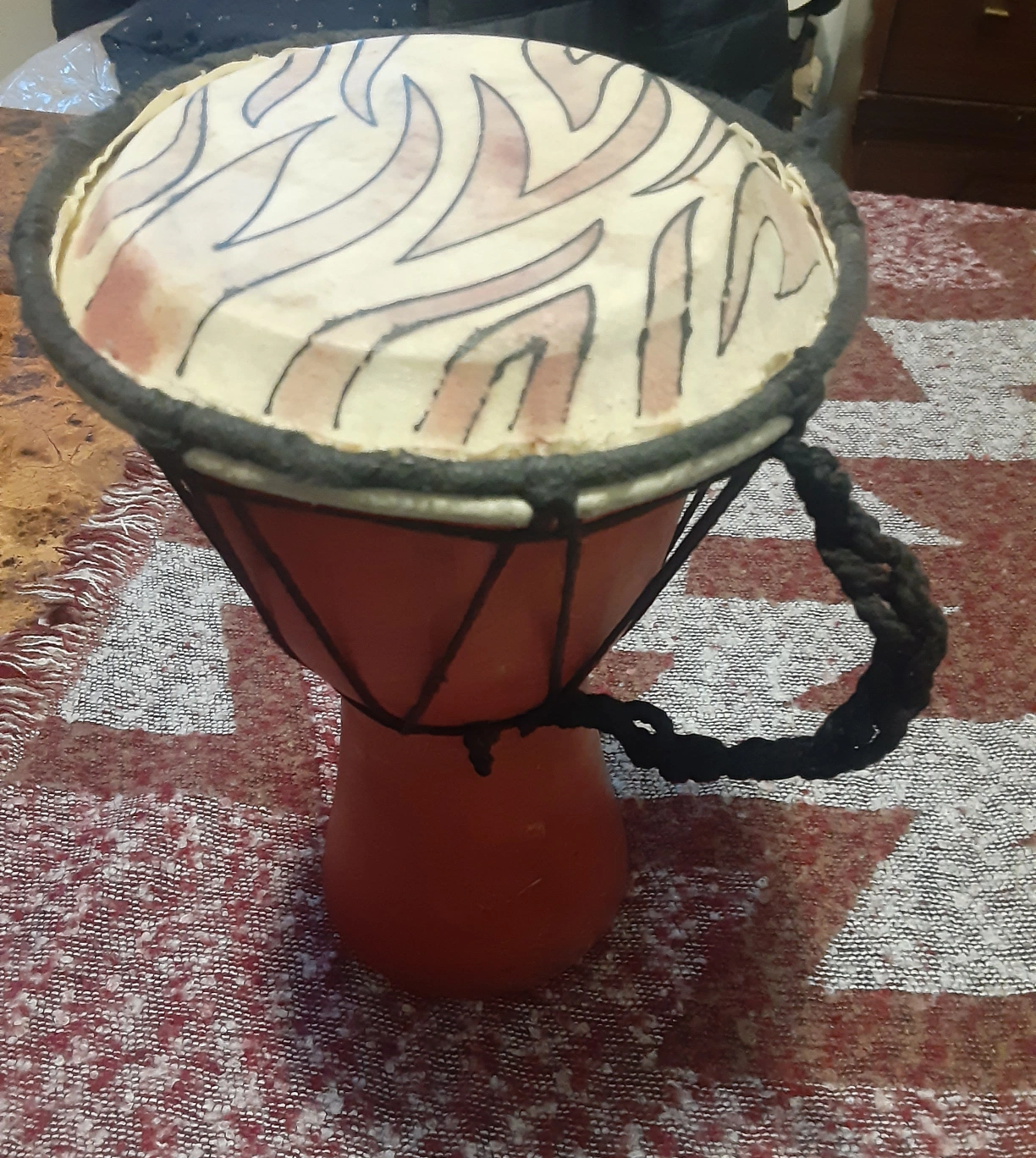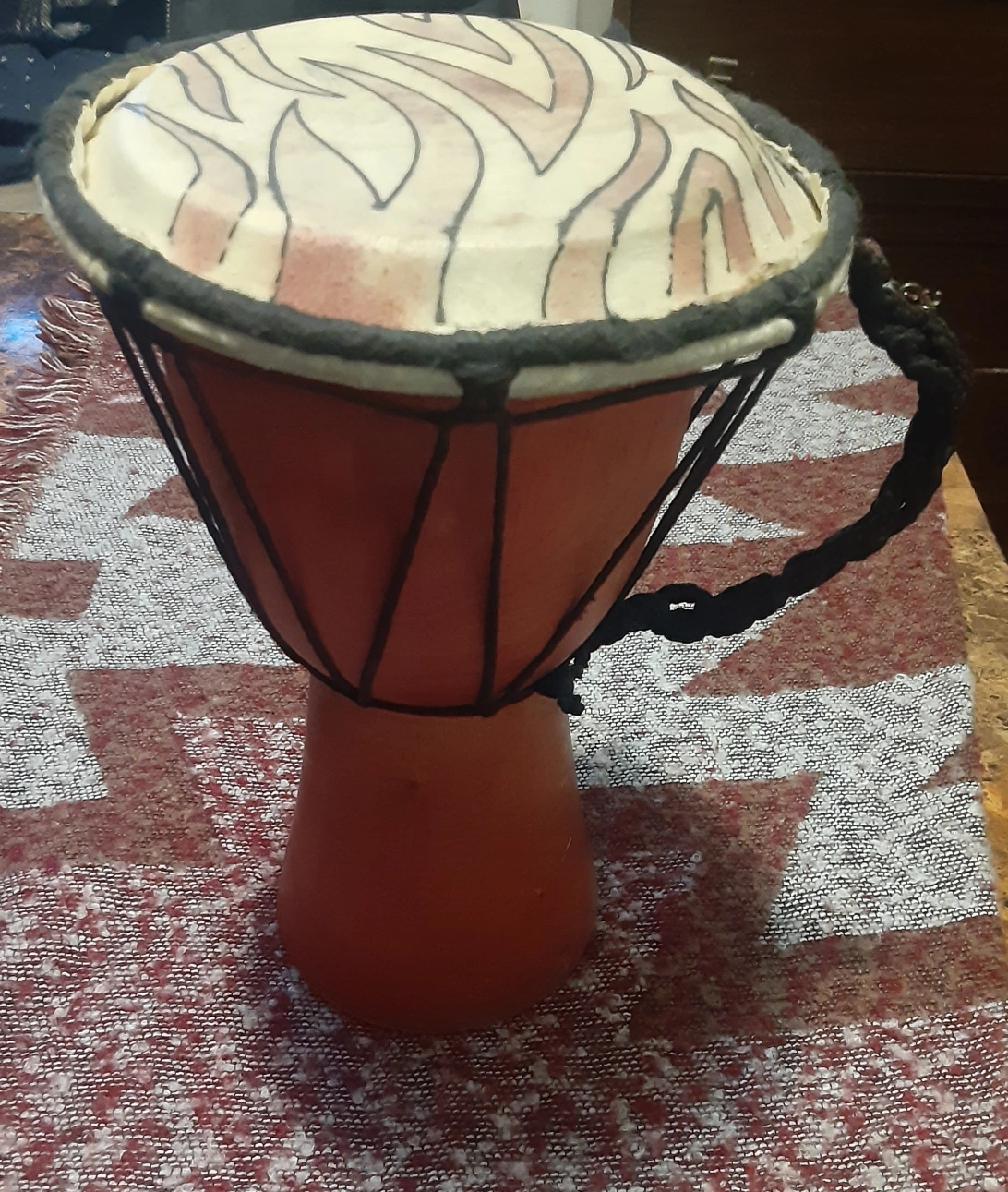 297Small, red, wooden drum. Features a unique zebra-striped design on the drumhead. Includes a carrying handle. Perfect for decoration or playing.