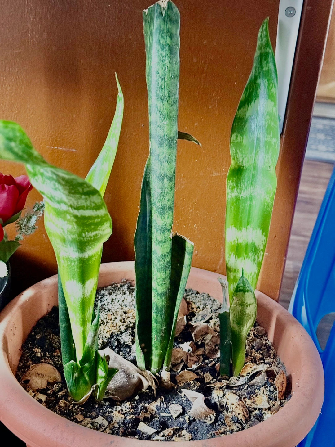 Three snake plants, potted together. Healthy-looking leaves. Planted in a terracotta pot. Small pieces of broken pottery mixed in with soil.