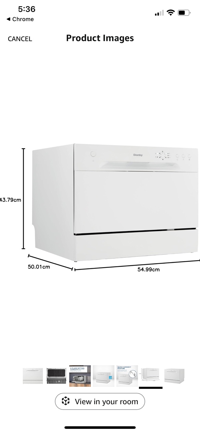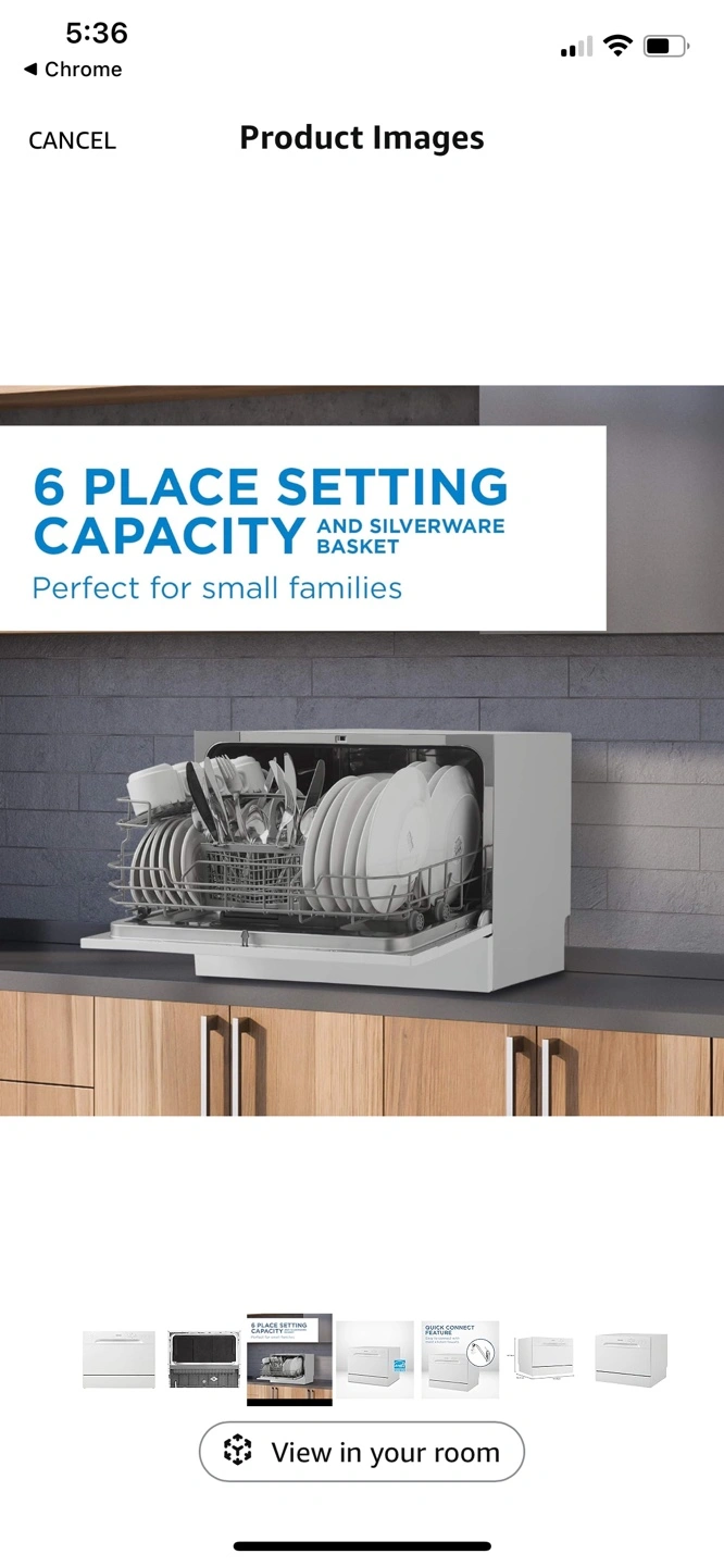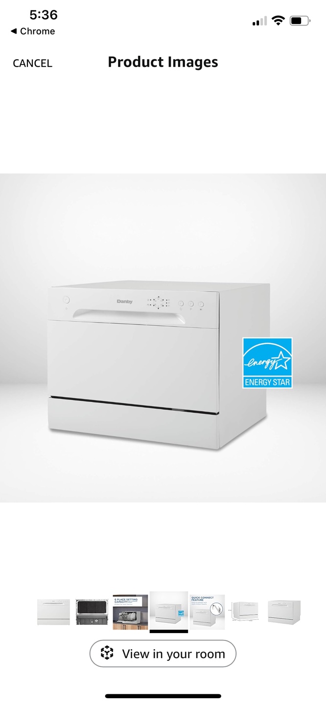 White countertop dishwasher. Six place setting capacity. Energy Star certified. Compact size, ideal for small spaces. Includes silverware basket.