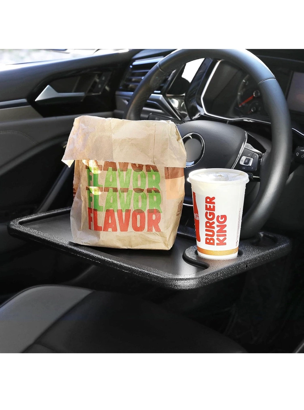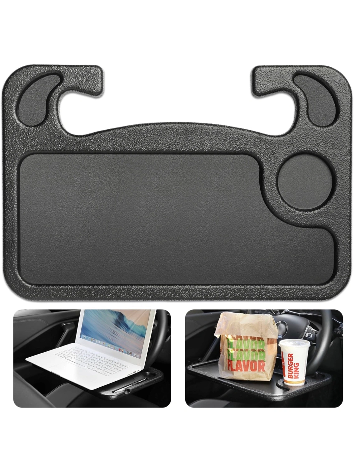 Multifunctional tray fits over steering wheel. Features cup holder, food holder, pen slot, and notebook support. Easy to clean, durable plastic. Perfect for eating, working, or studying in your car.