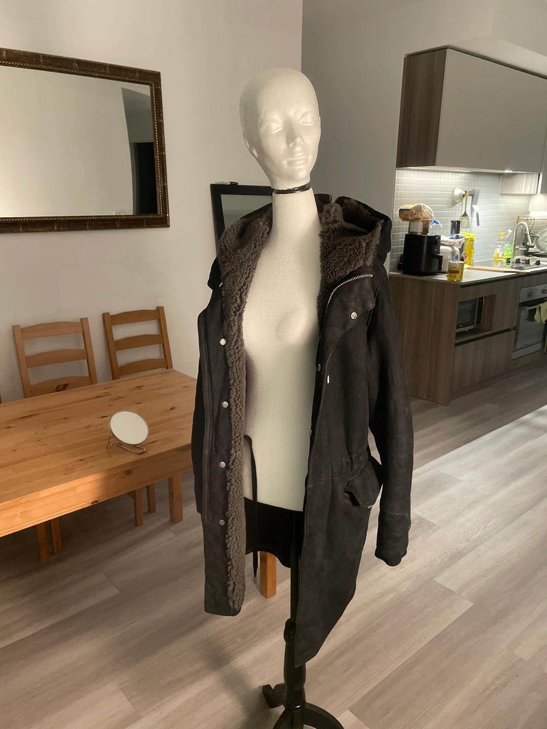Long black sheepskin coat. Features a grey sherpa lined hood, zipper and button closure, and pockets. Excellent for colder weather.