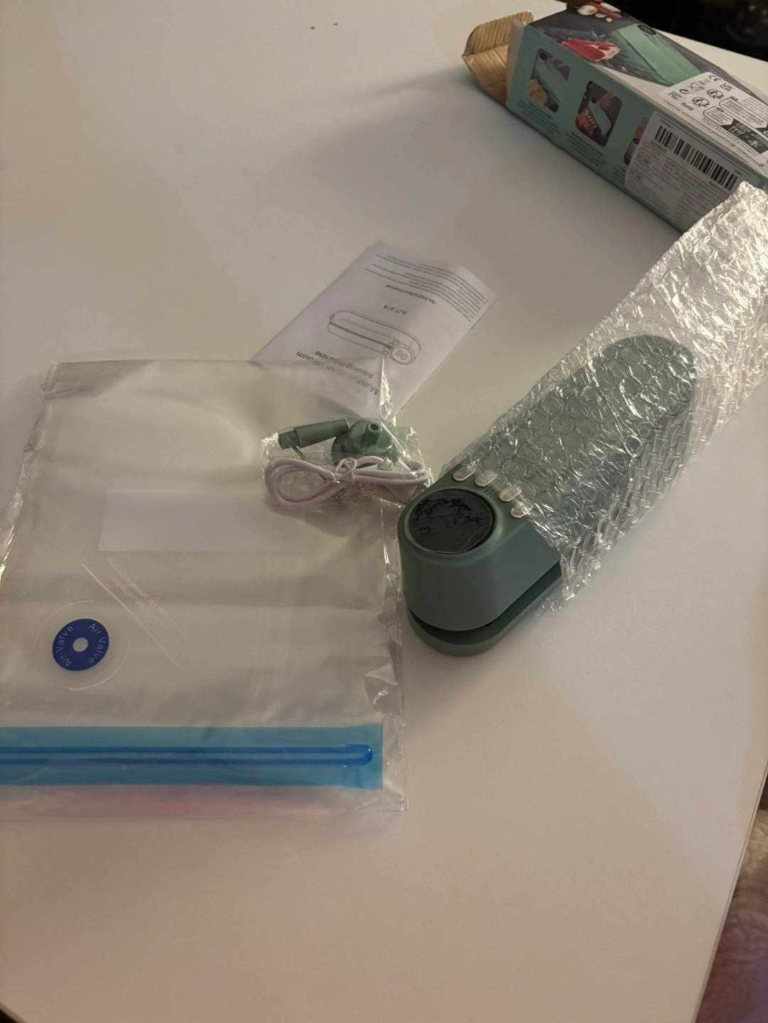 Handheld vacuum sealer. Great for food preservation. Includes vacuum bags. Digital display. Easy to use.