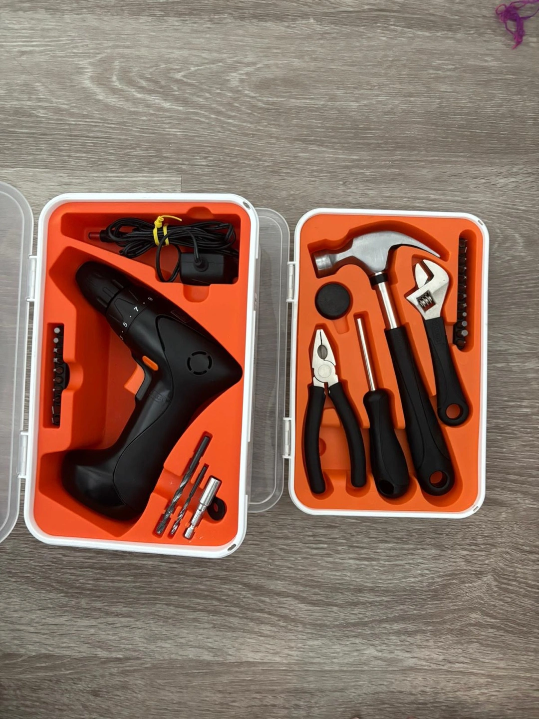 Portable cordless drill and assorted hand tools. Includes drill bits and screwdriver bits. Great for small repairs.