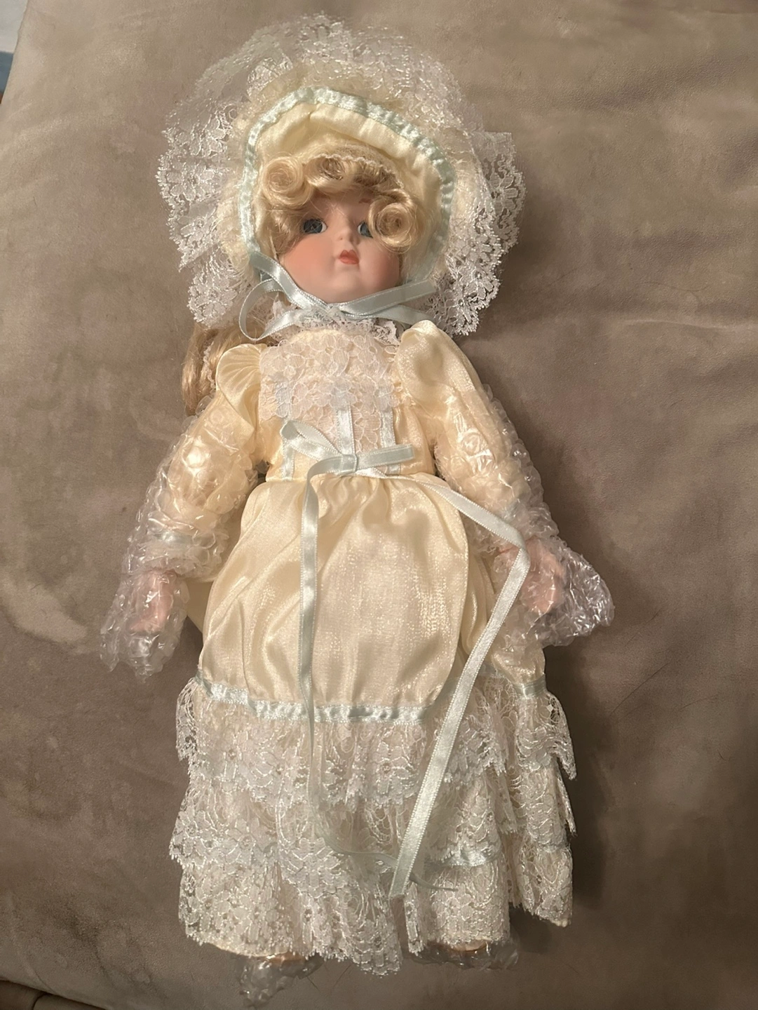 Adorable vintage porcelain doll. Blonde hair, pale yellow dress, with blue ribbon and white lace accents. Comes in original box. Hands & feet still bubble wrapped. Hair still in tiny hair net. Collectible item.