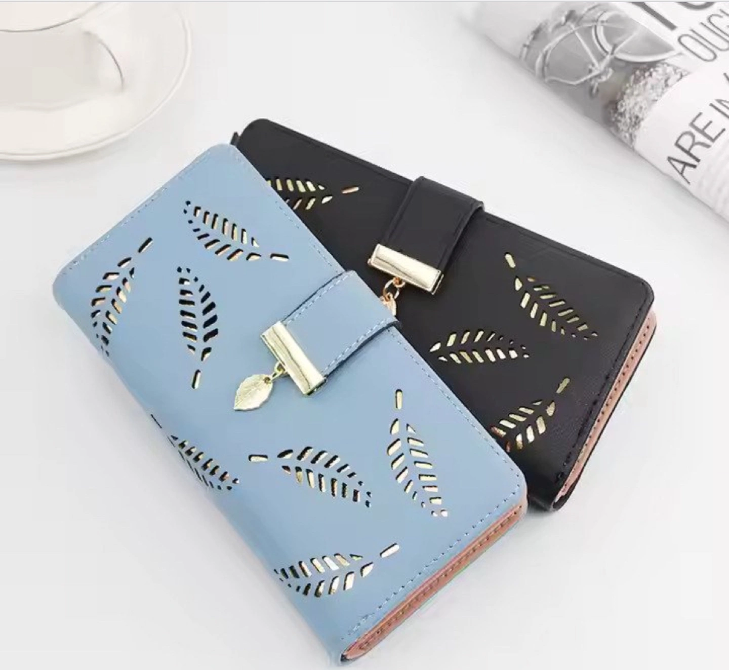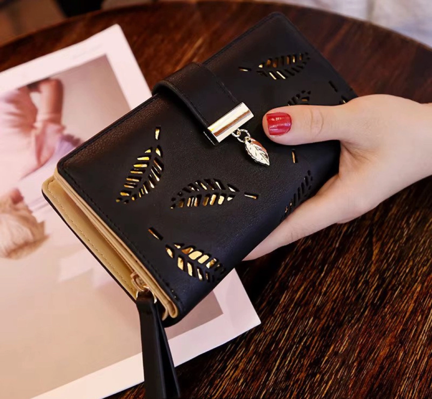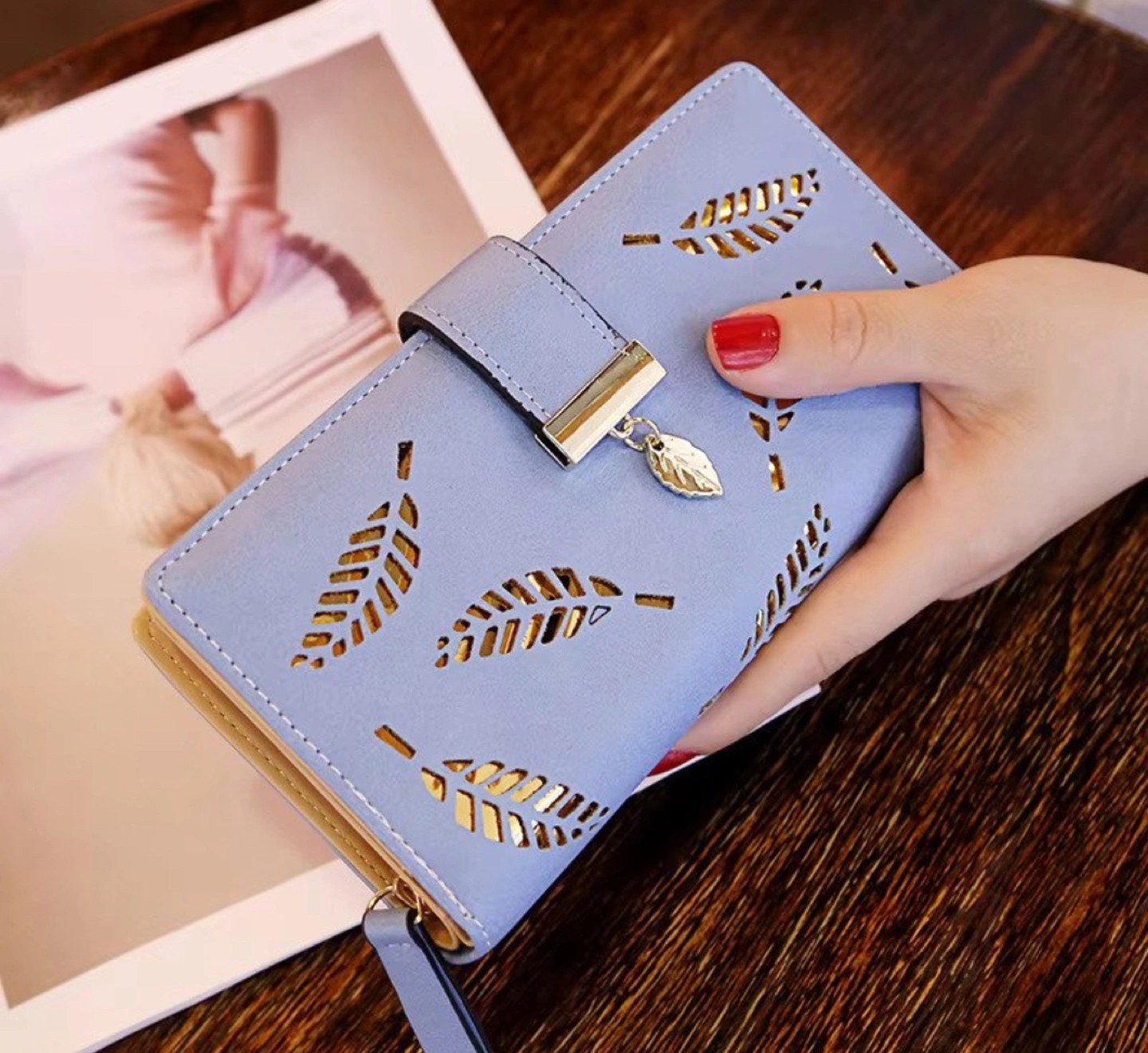10Stylish ladies' wallet. Features a leaf cut-out design. Multiple colours available. Zipper closure. Compact design. Perfect for everyday use.