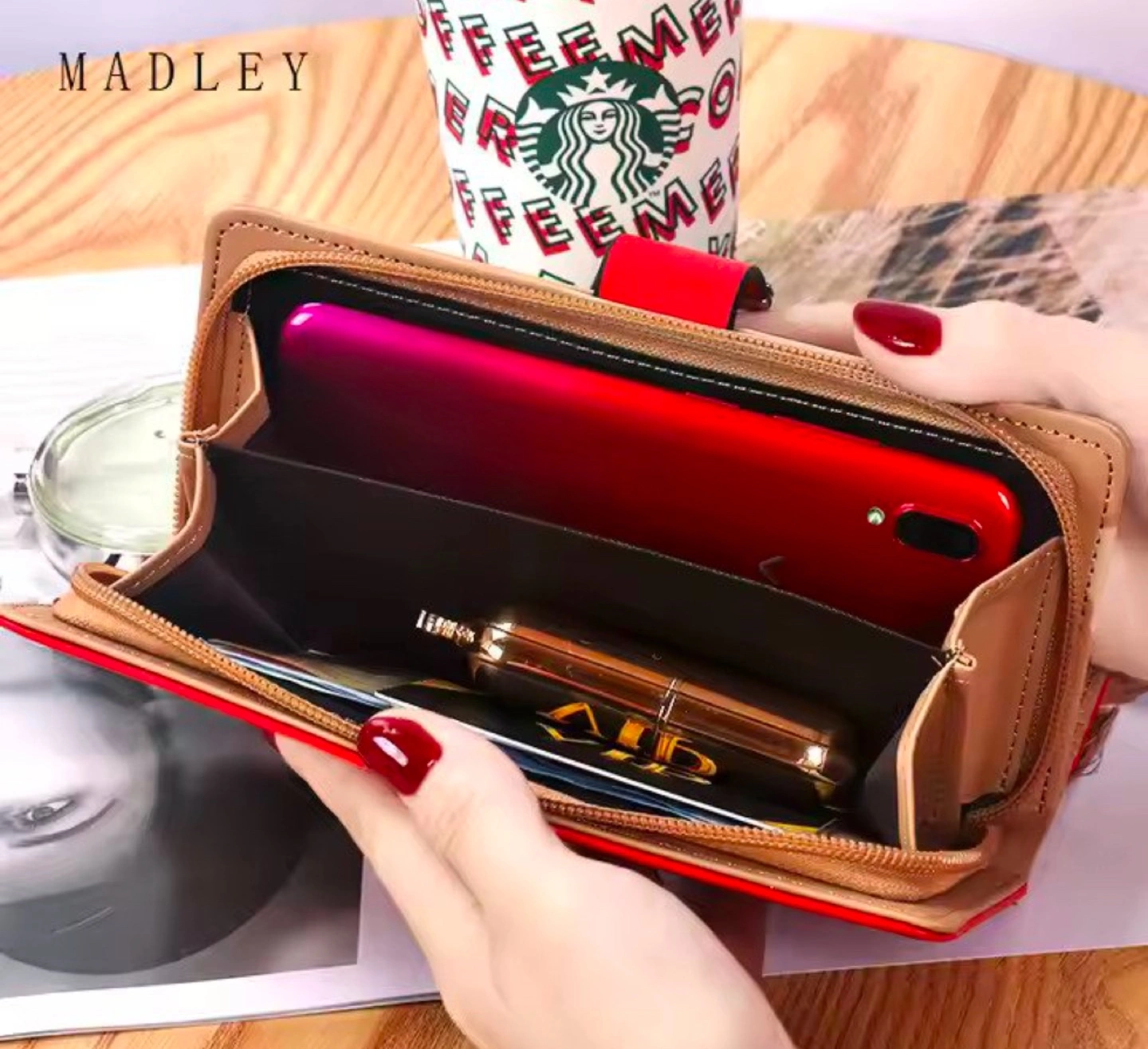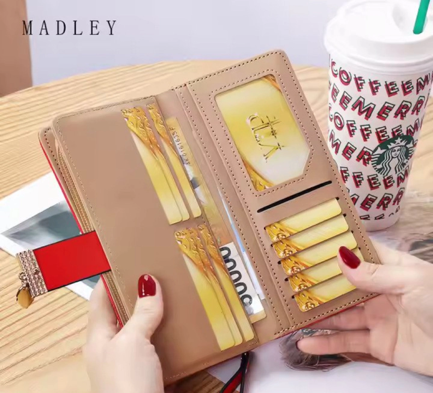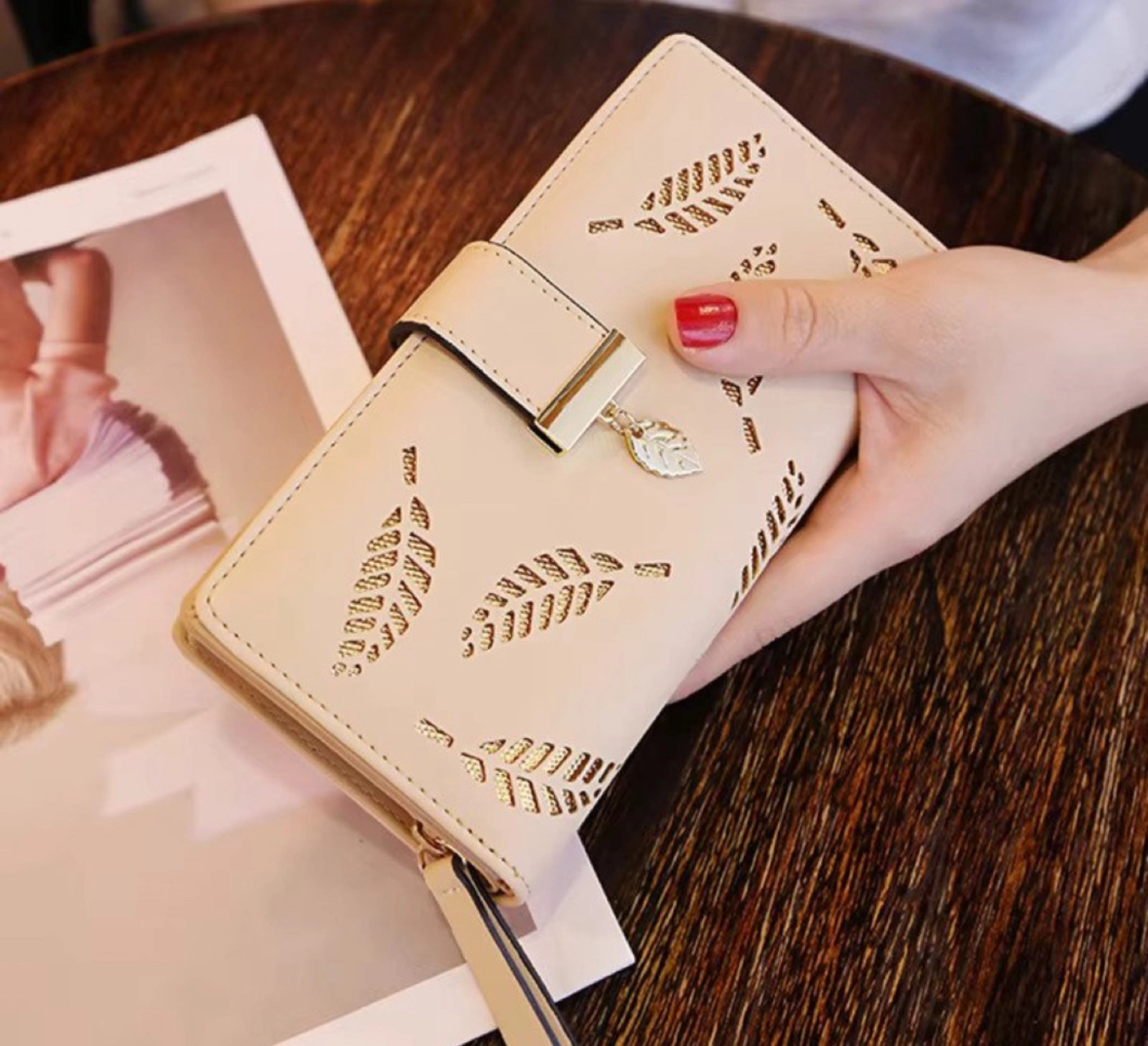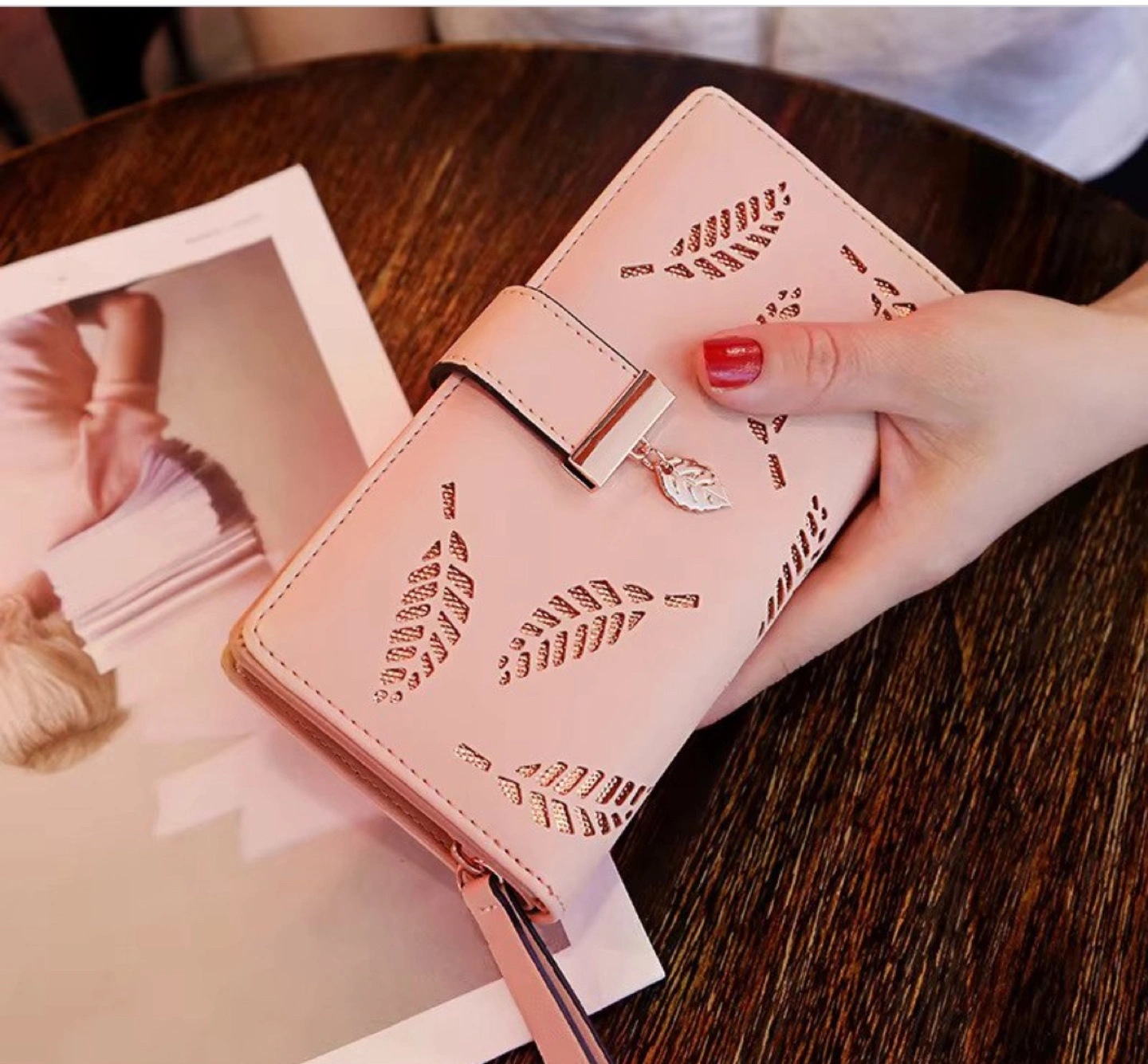 10Stylish ladies' wallet. Features a leaf cut-out design. Multiple colours available. Zipper closure. Compact design. Perfect for everyday use.