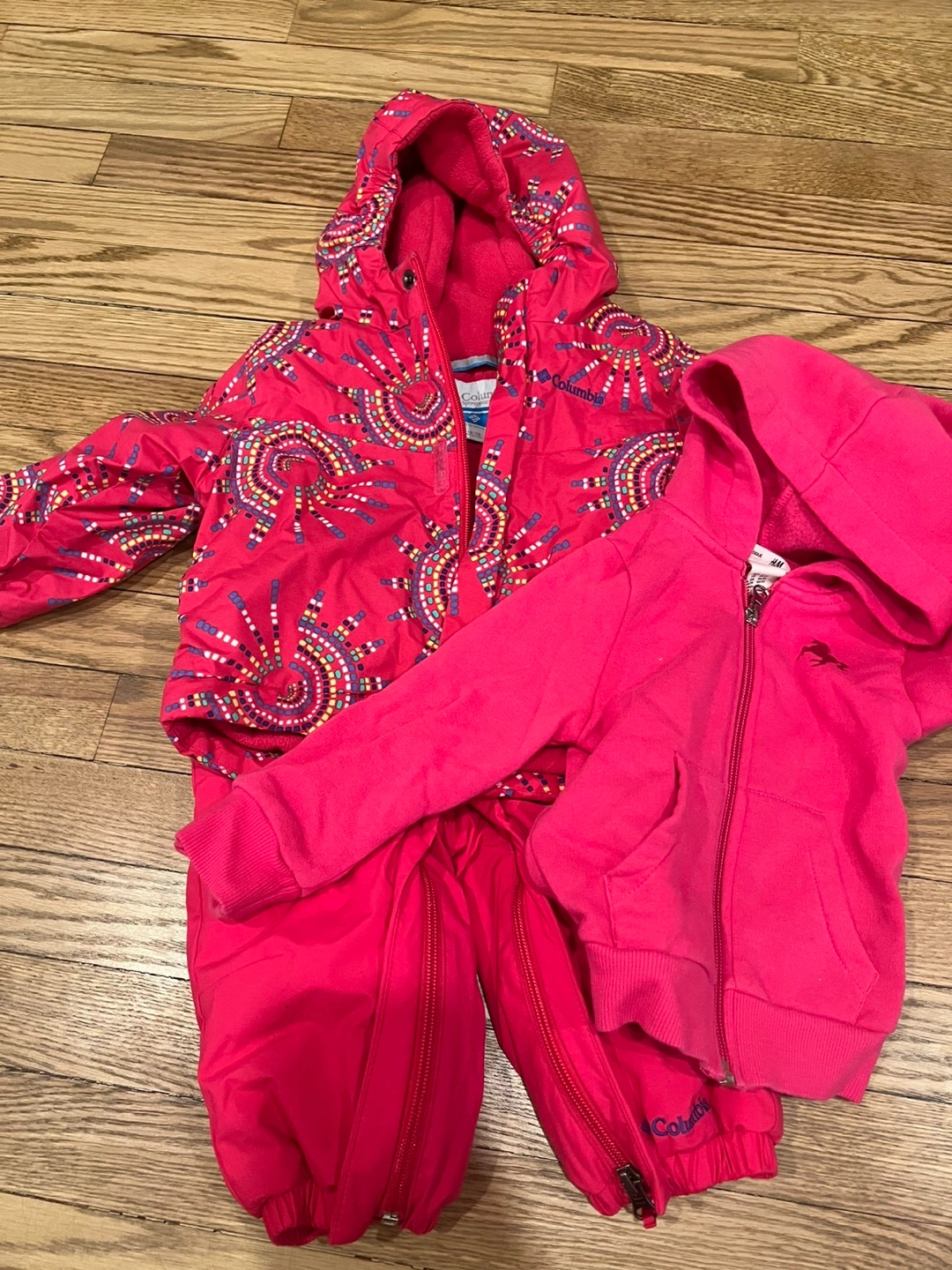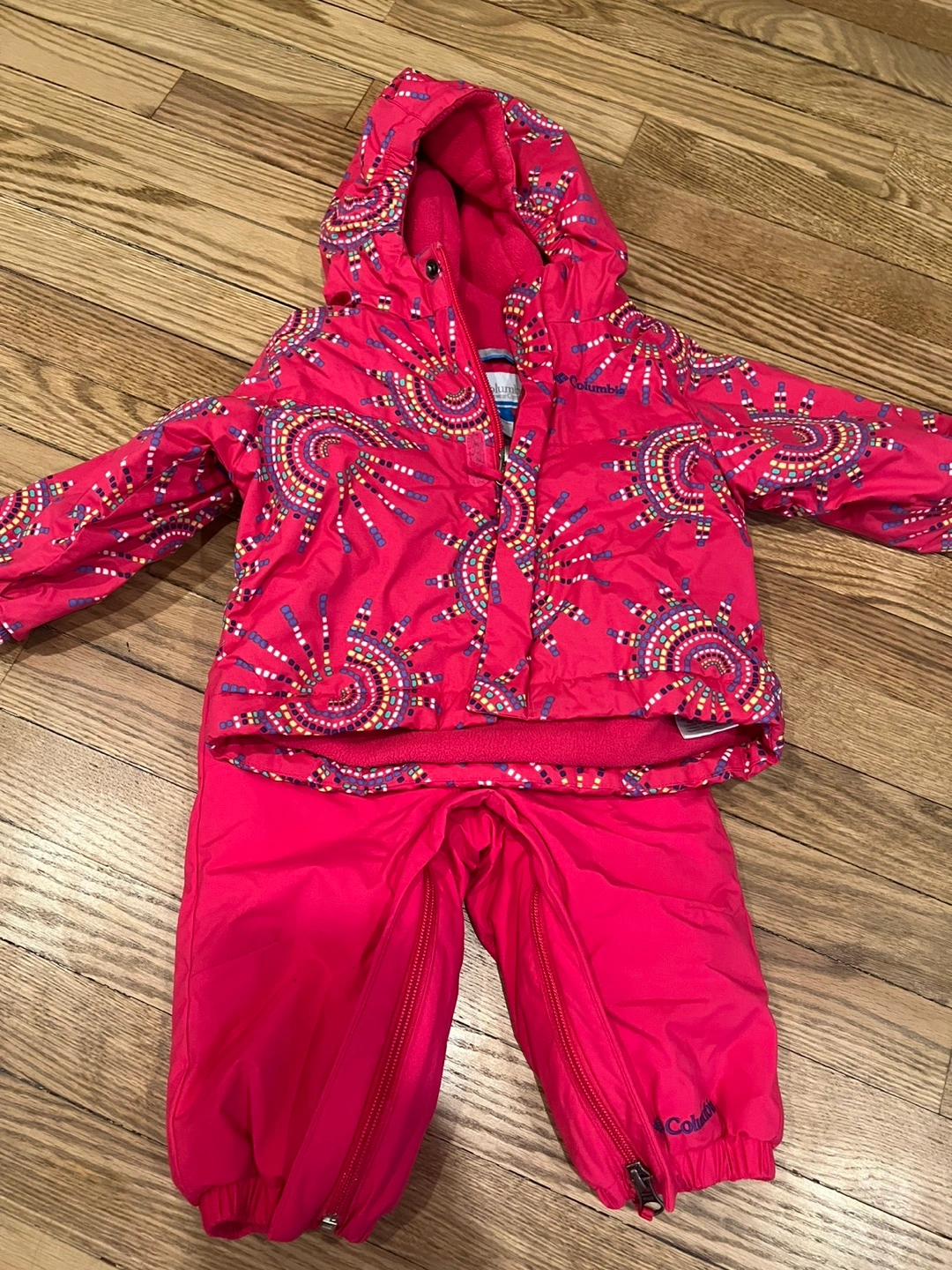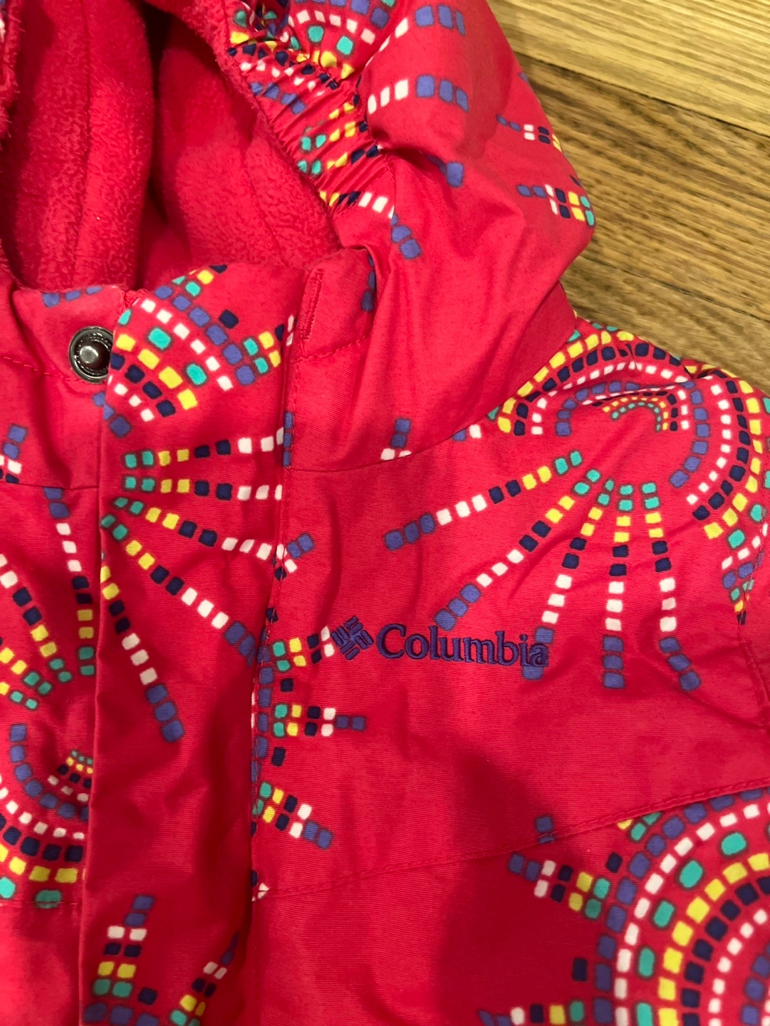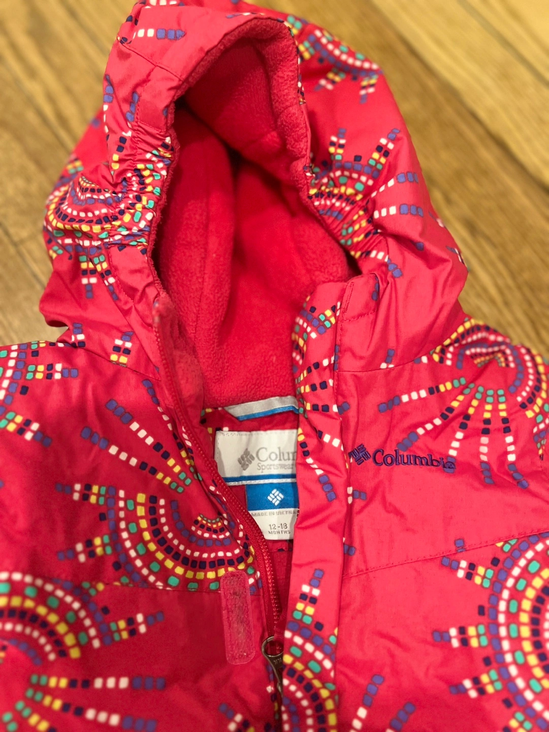 15Adorable Columbia snowsuit. Pink with colourful pattern. Includes jacket and snow pants. Fleece-lined hood. Zippers on pants. Great for winter weather. Plus free pink zip up hoodie