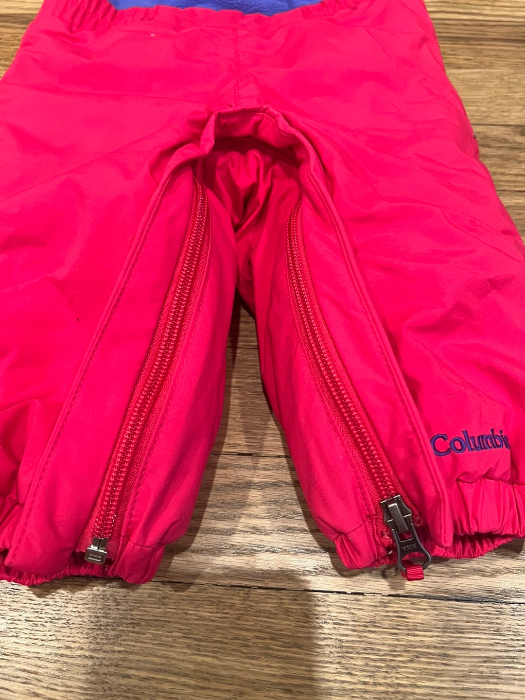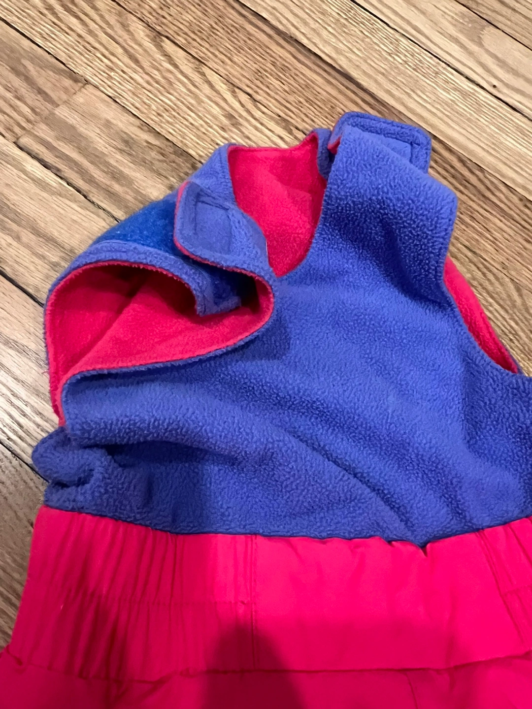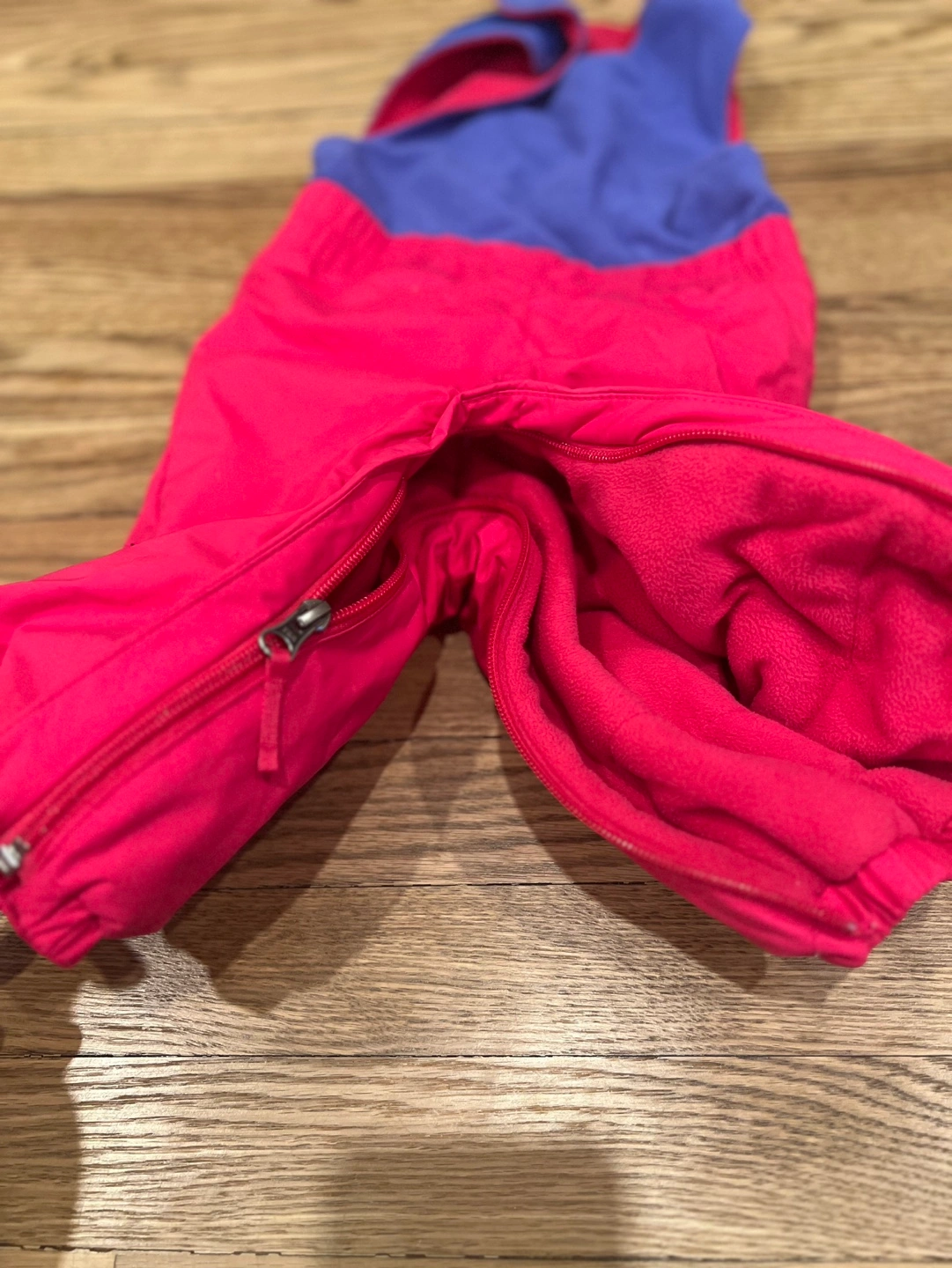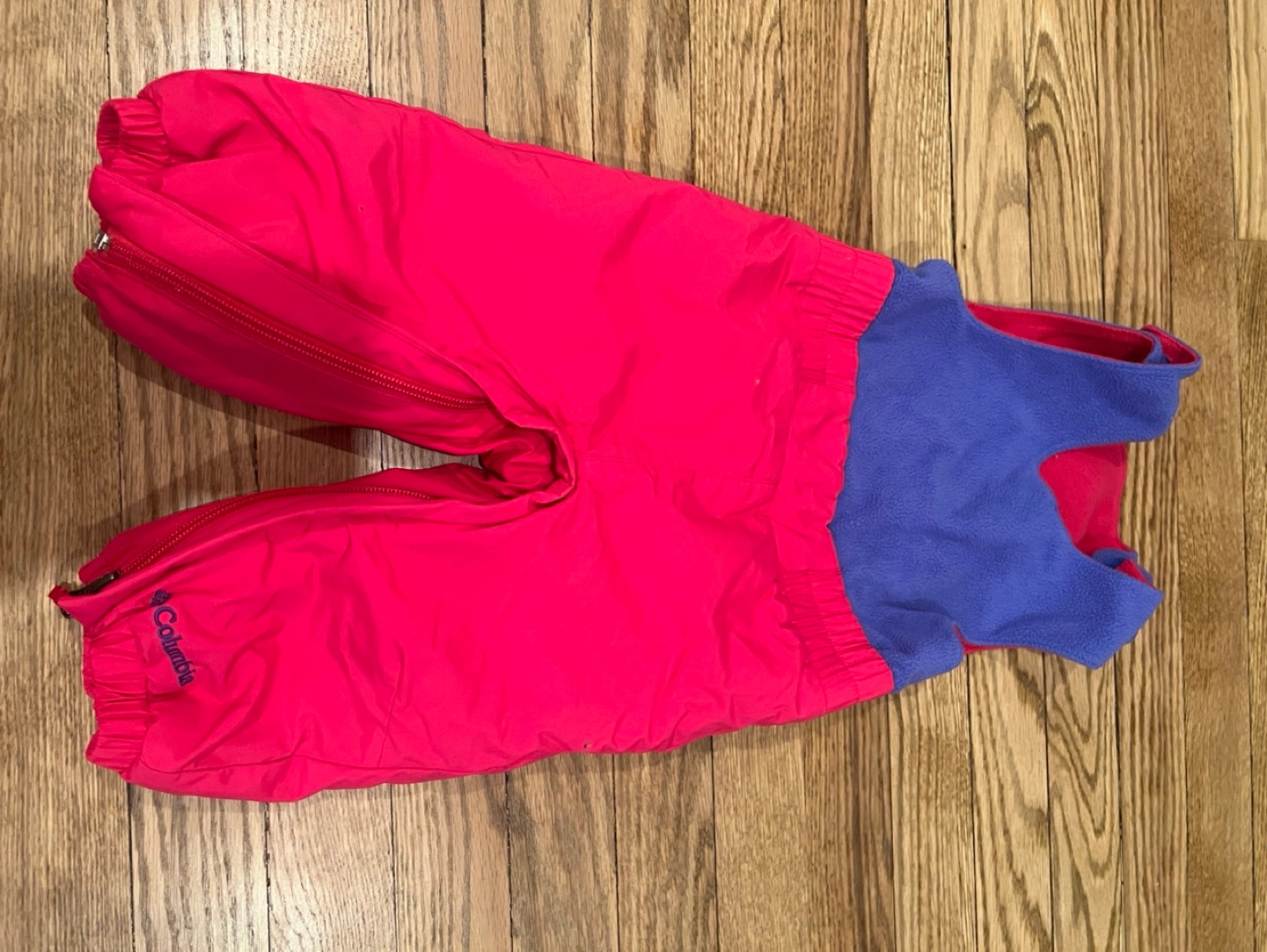 15Adorable Columbia snowsuit. Pink with colourful pattern. Includes jacket and snow pants. Fleece-lined hood. Zippers on pants. Great for winter weather. Plus free pink zip up hoodie