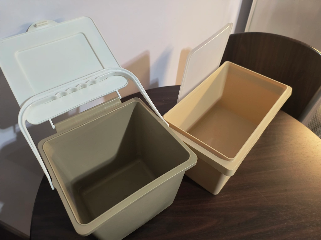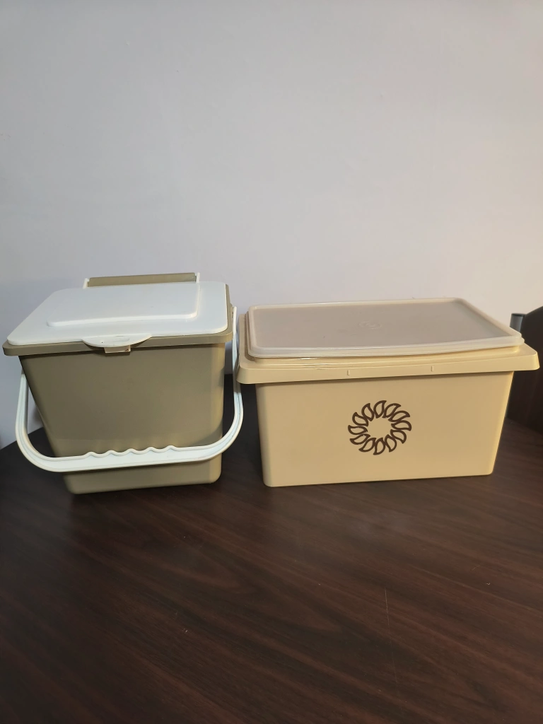 Set of two vintage plastic storage containers. One square, one rectangular. Both have lids and handles. Perfect for organizing or storing household items. Show minor wear from age. They were used to store crayons, stamps and craft supplies.
