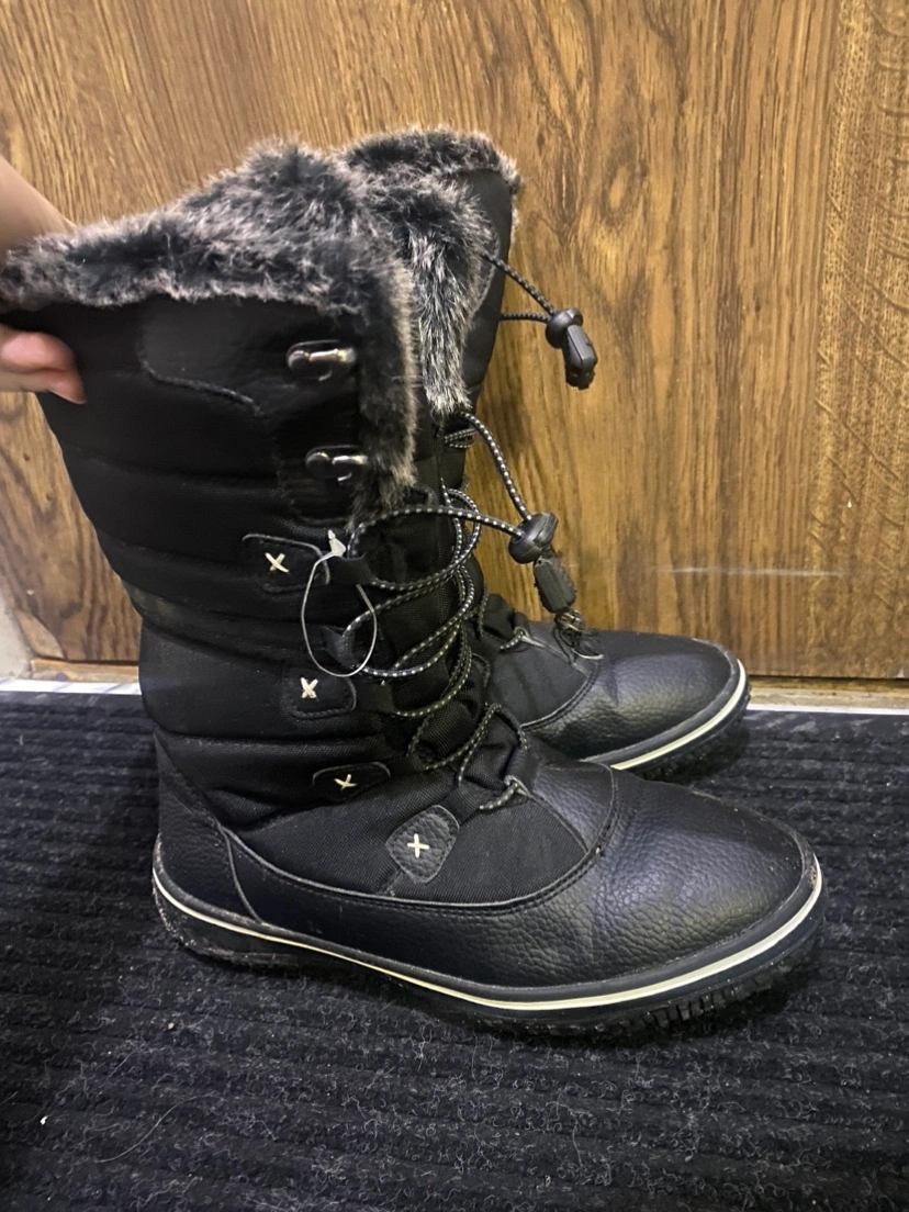 Women's black winter boots. Lace-up style. Size US 8. Good for snow! Ideally I’d say it fits a 7😅 I’m 7.5 and it’s a tad tight for my feet. Selling it cheap because someone could use this - I only wore it once for sledding and is in mint condition :)