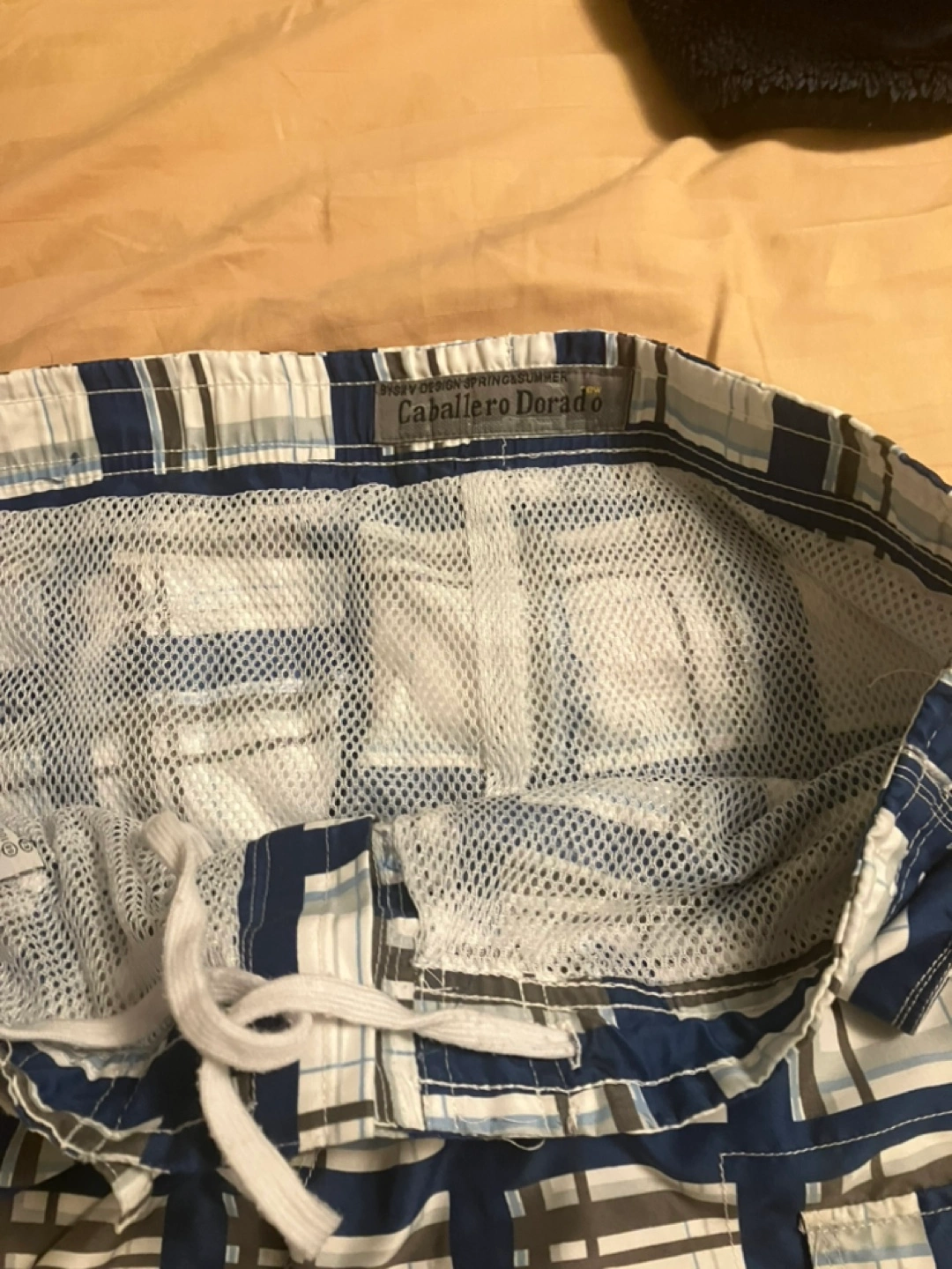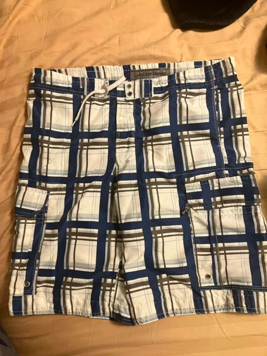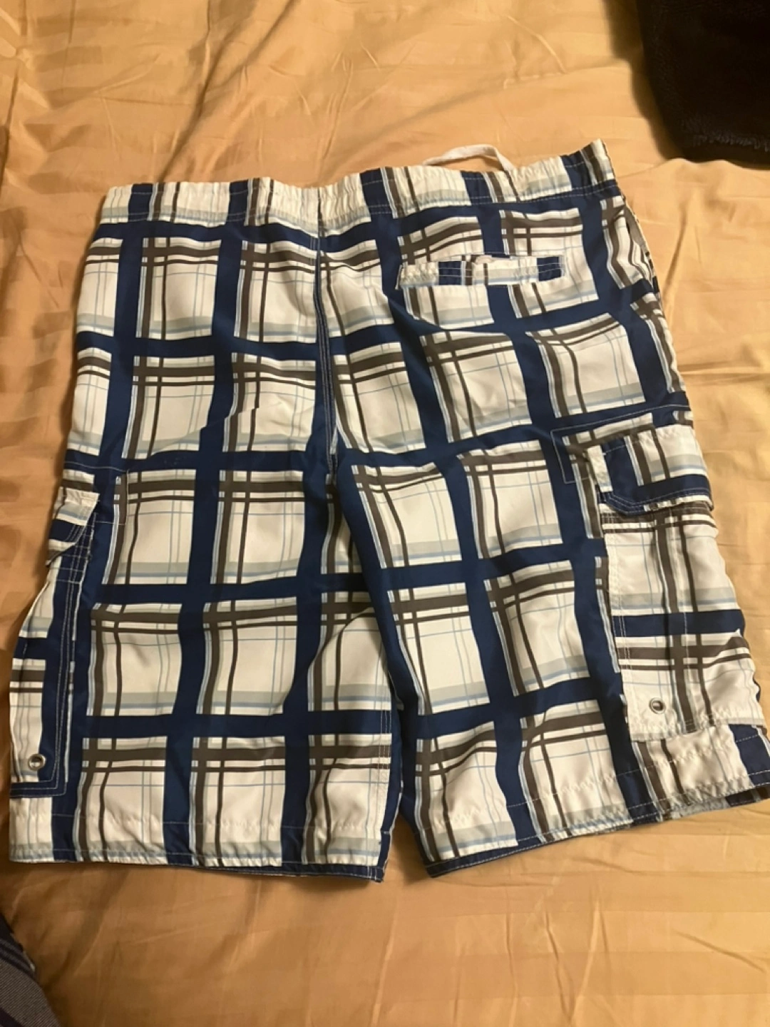 Men's swim trunks. Blue, white and brown plaid pattern. Mesh lining. Two side pockets and one back pocket. Drawstring closure.