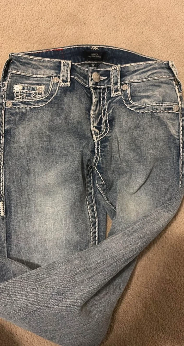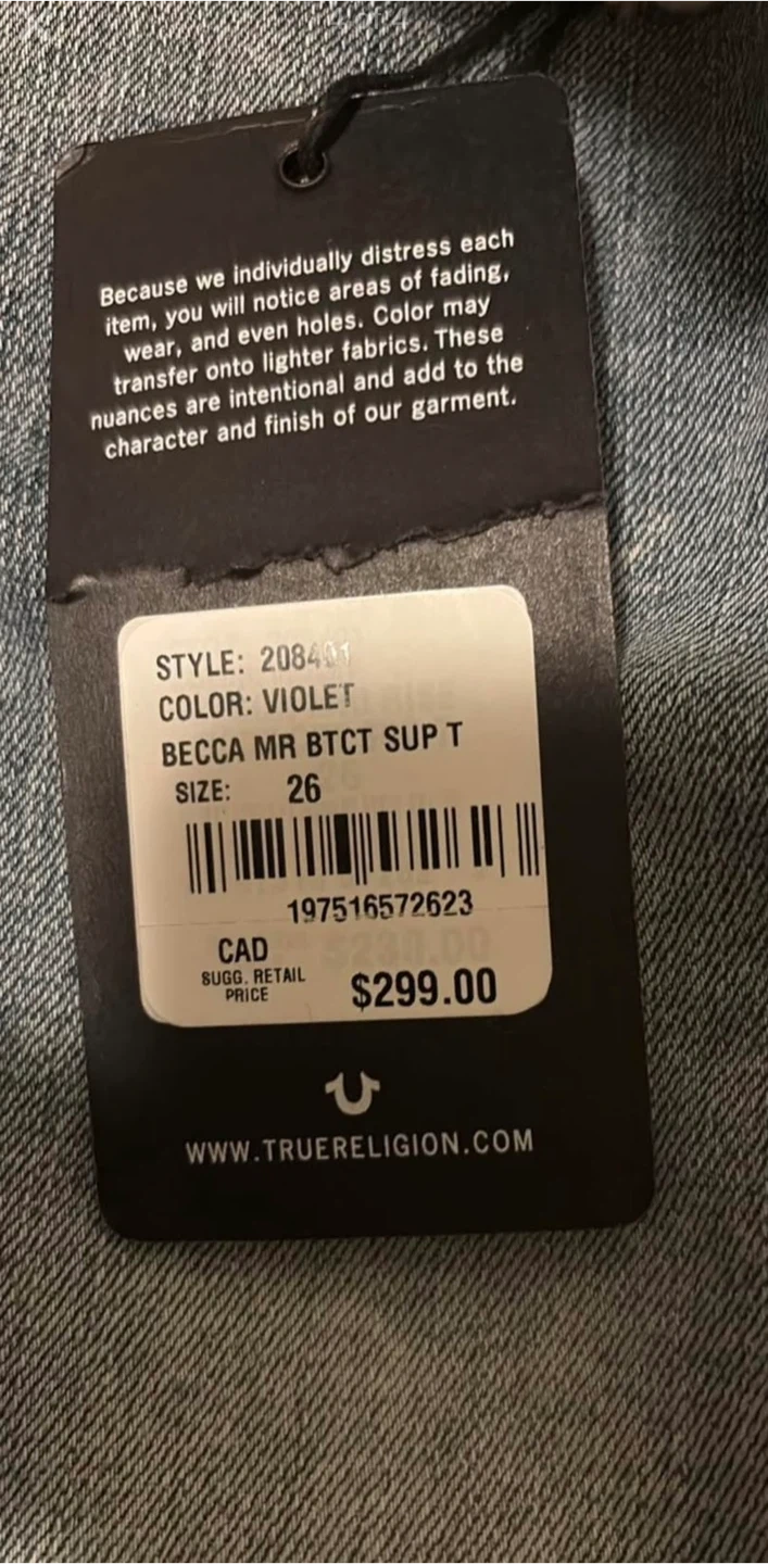 These are True Religion BECCA MR BTCT SUP T jeans in a size 26. They're a "Violet" colour. The jeans have a distressed denim look and feature signature contrast stitching. This style is designed to transfer onto lighter fabrics.