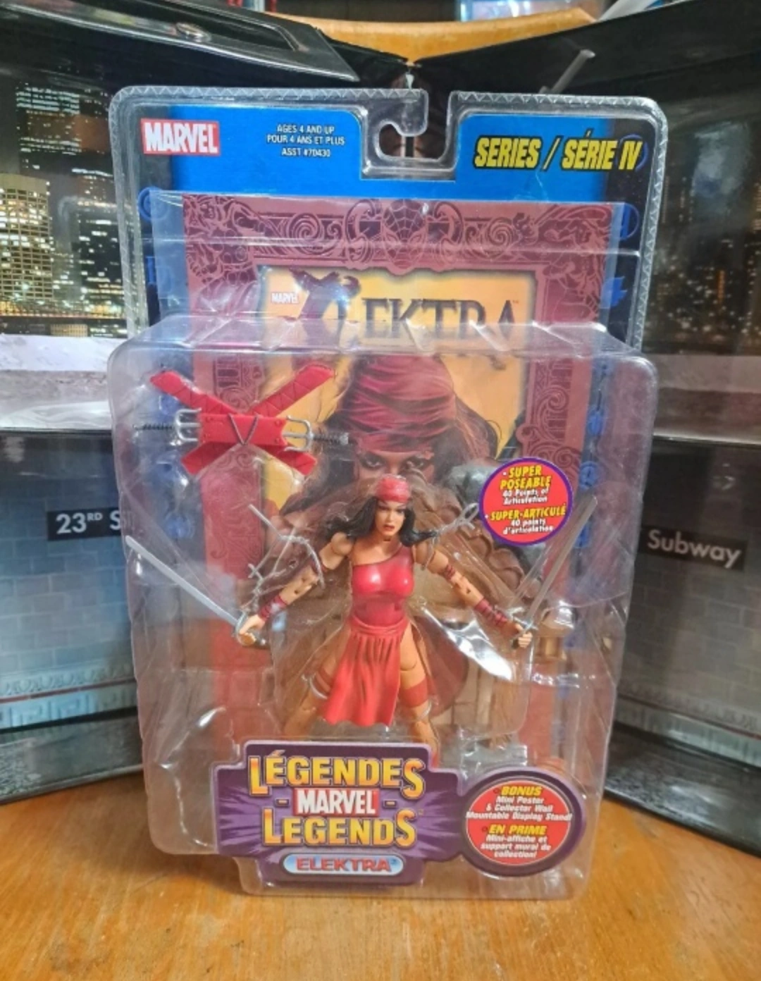 Collectible Marvel Legends Elektra action figure. Series 4. New in package. Includes accessories. Super poseable. Highly detailed.