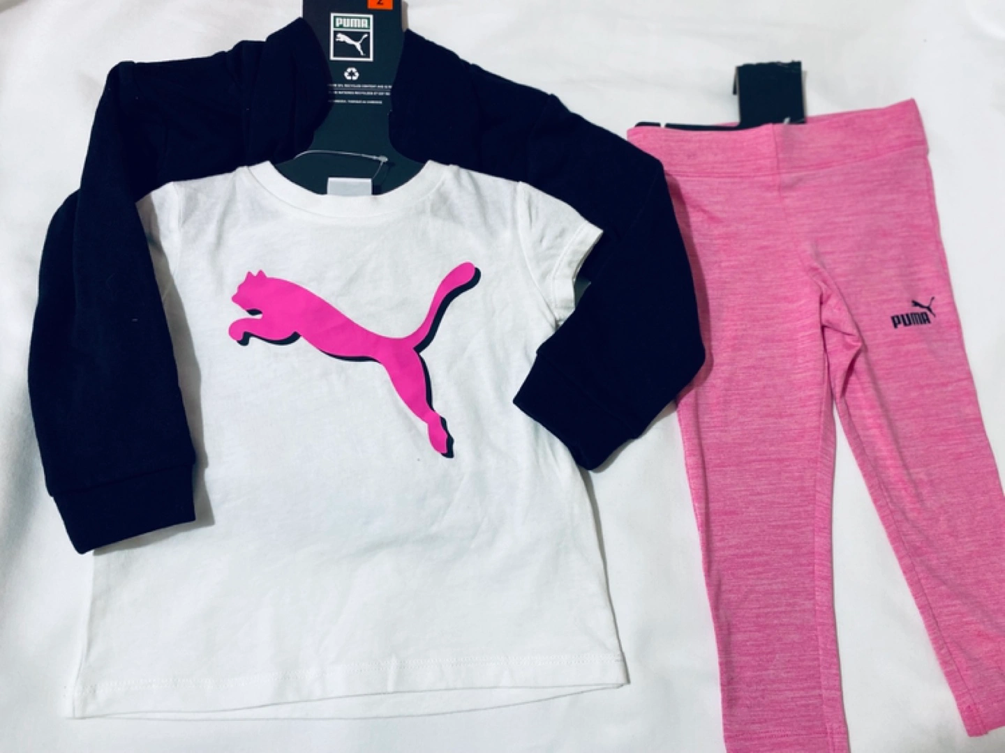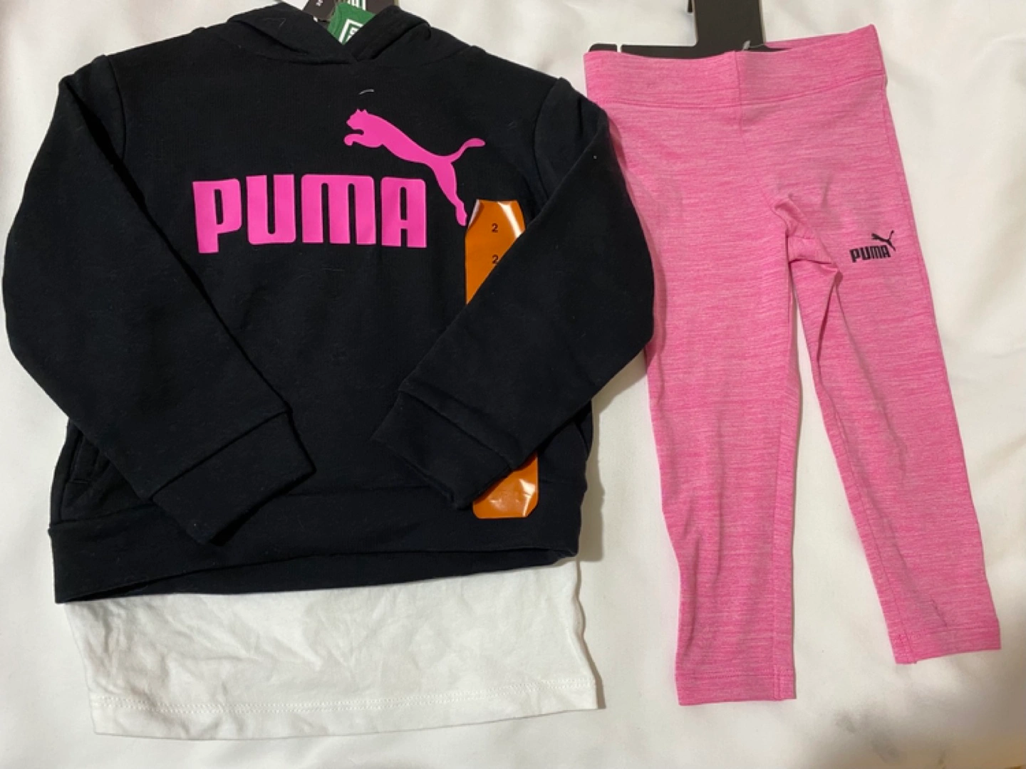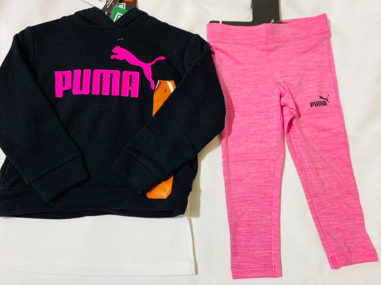Adorable Puma outfit for girls. Includes a black hoodie with pink Puma logo and pink leggings. Perfect for playtime or lounging. New with tags.
