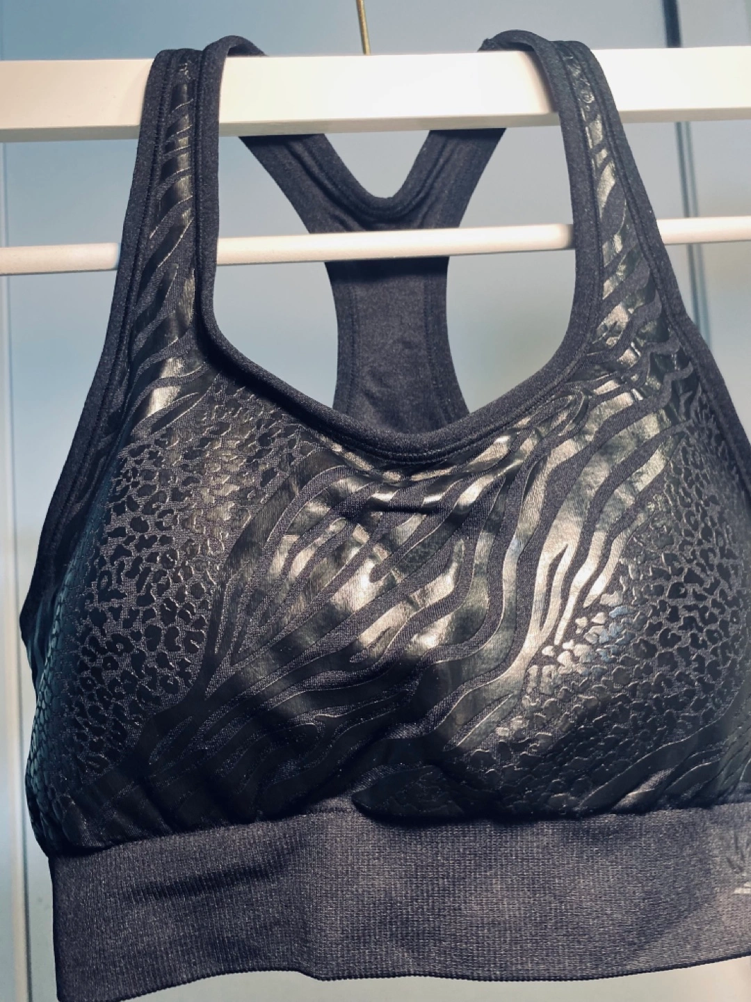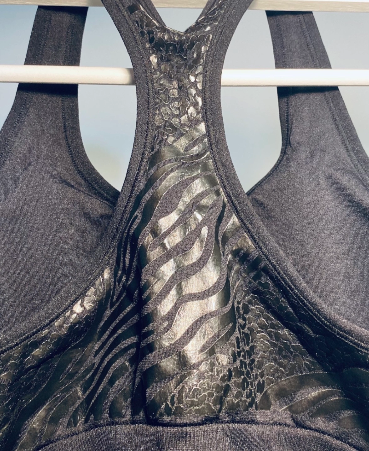 Black sports bra. Racerback style. Zebra print design. Supportive and comfortable. Great for workouts.