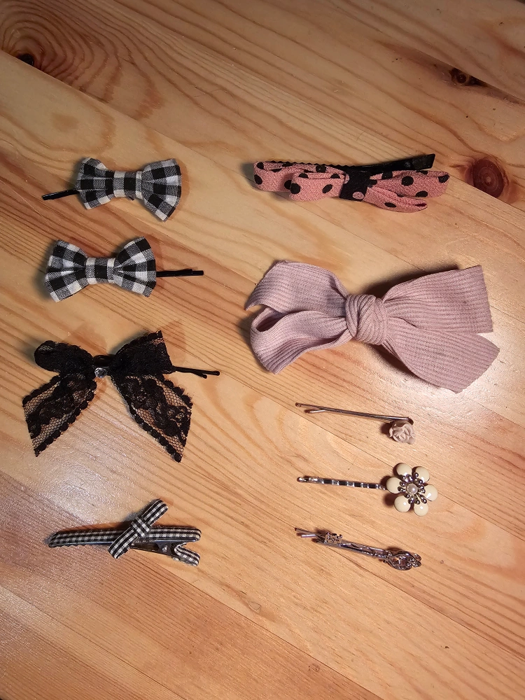 Assortment of hair accessories. Includes various bow clips, bobby pins, and decorative hair pins. Great for adding a touch of style to any hairstyle 😘