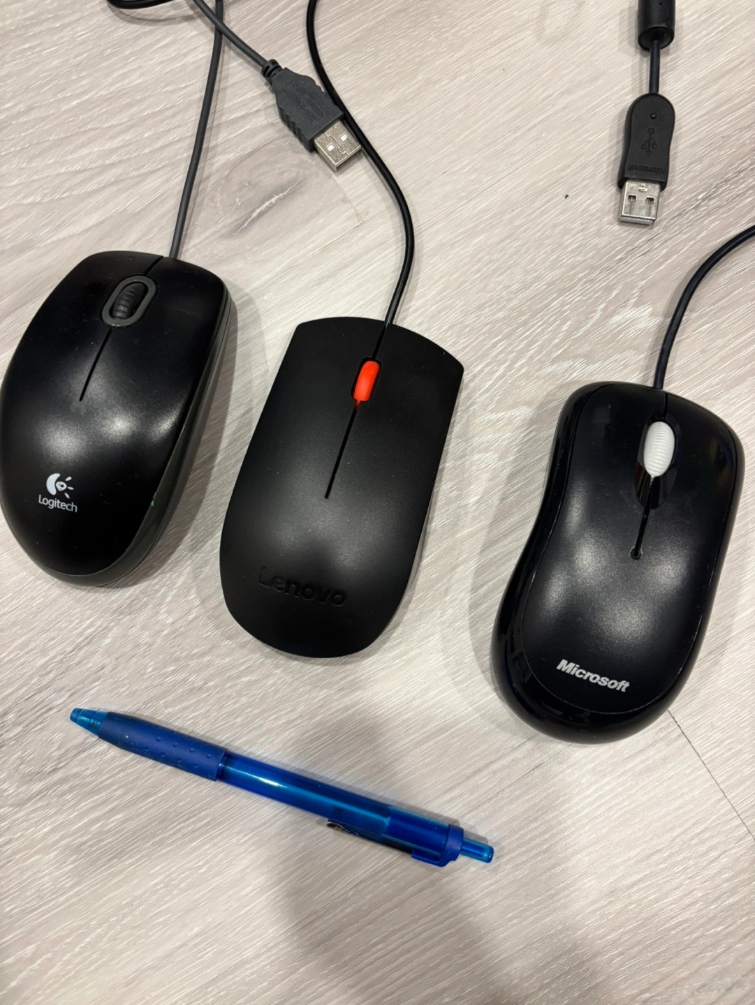 Three wired computer mice. Logitech, Lenovo, and Microsoft brands. USB connection.