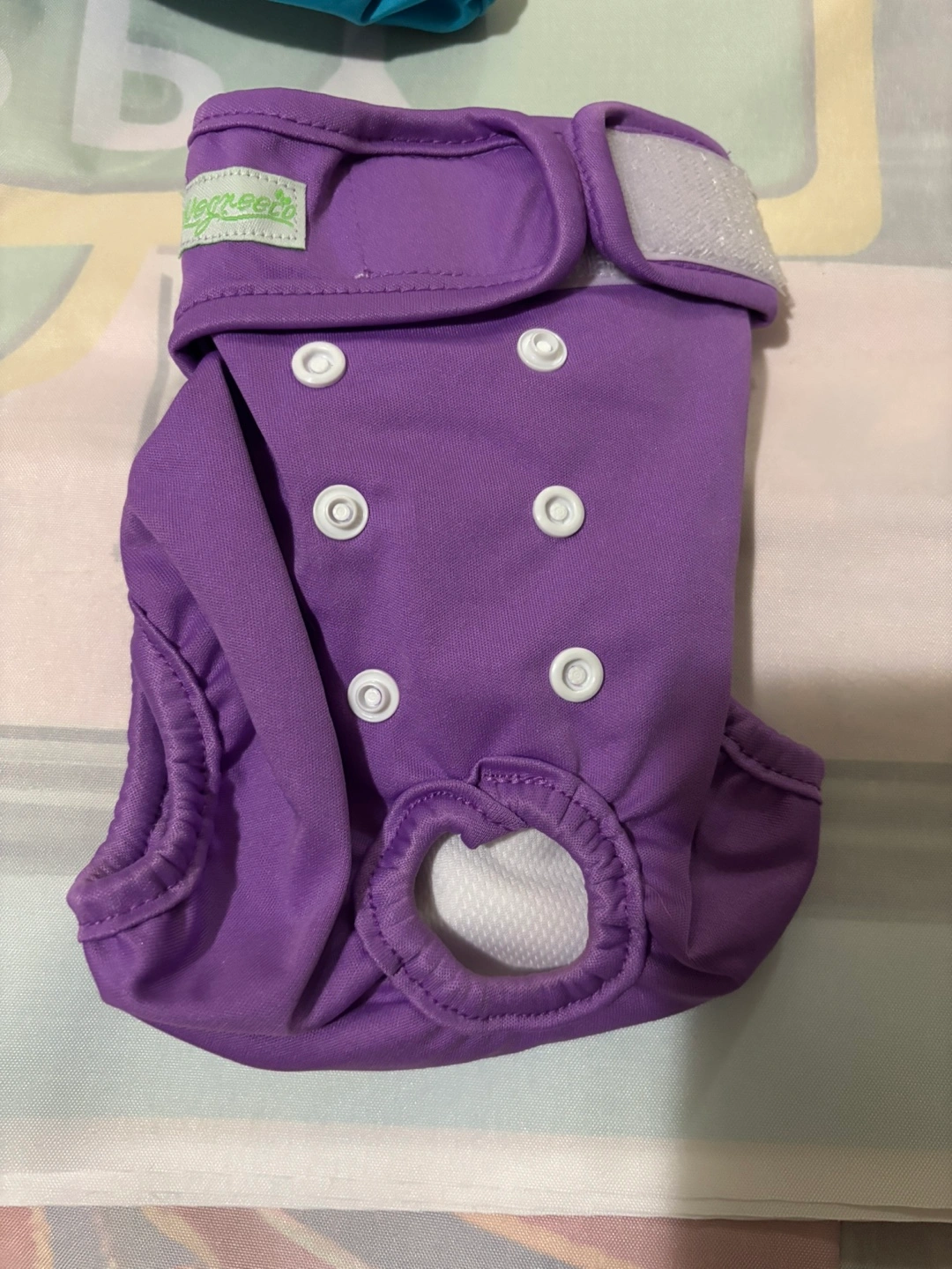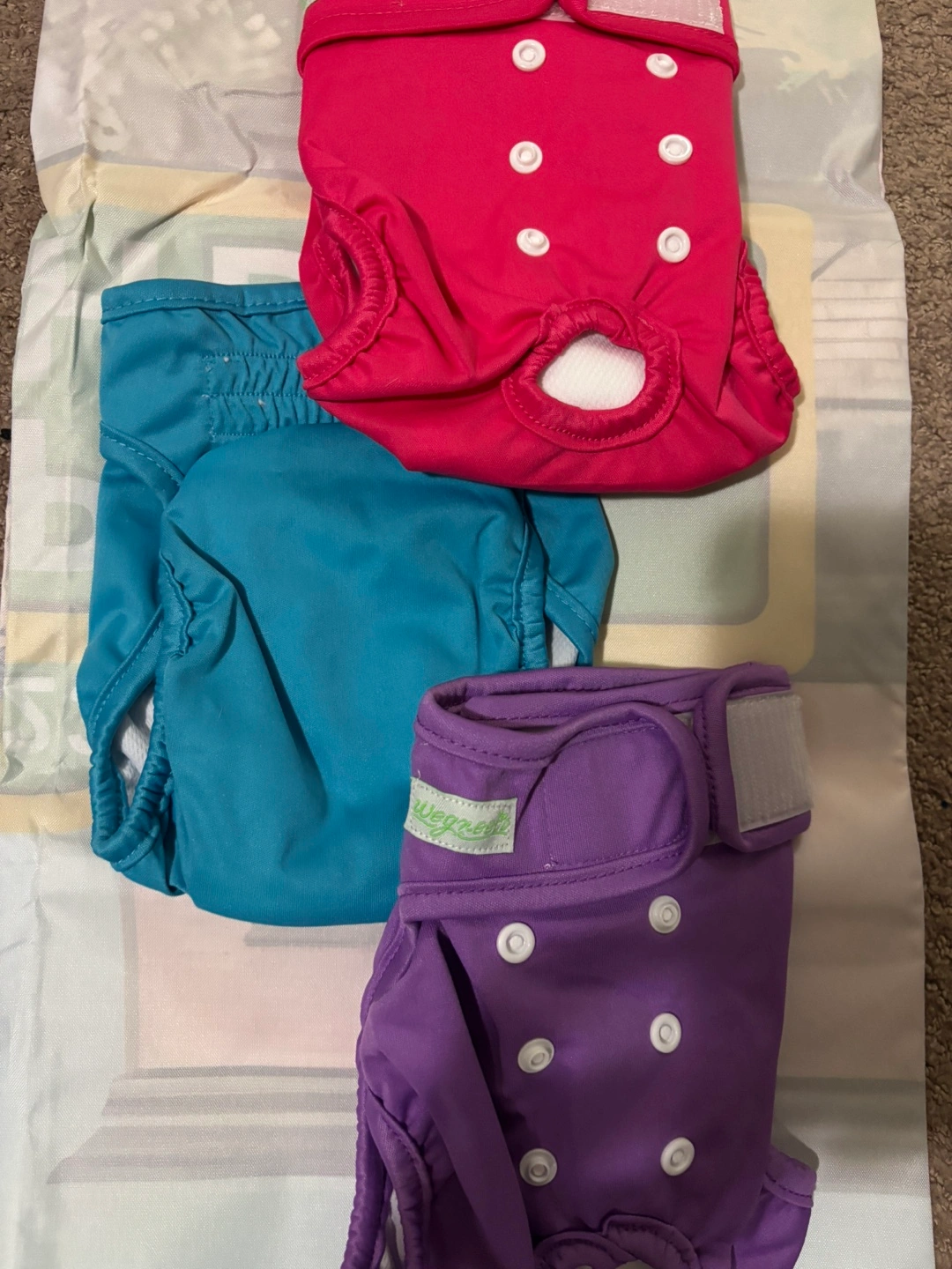 Set of three washable female dog diapers. Pink, teal and purple. Adjustable waistband. Snaps for secure fit. Great for heat or incontinence.