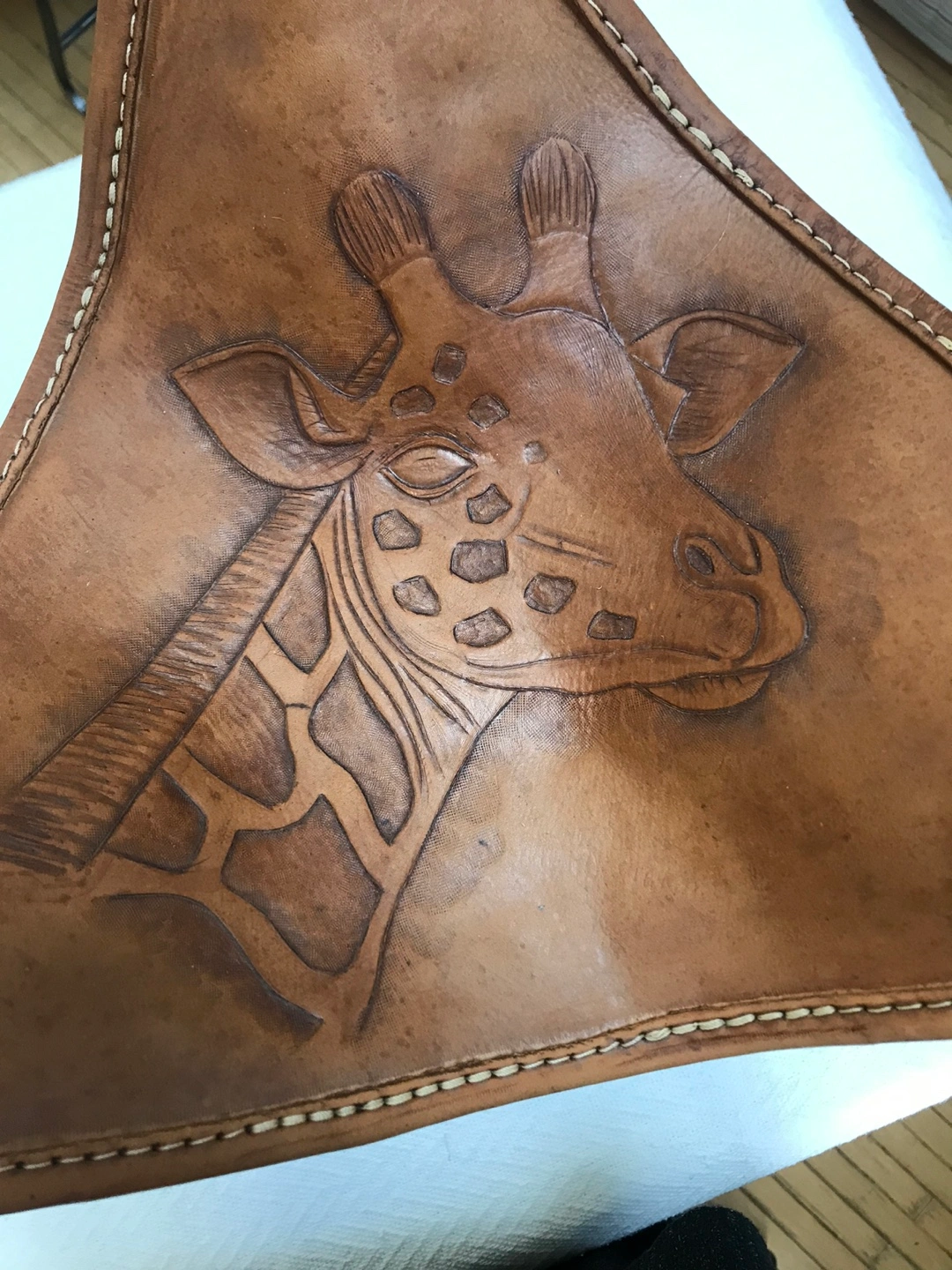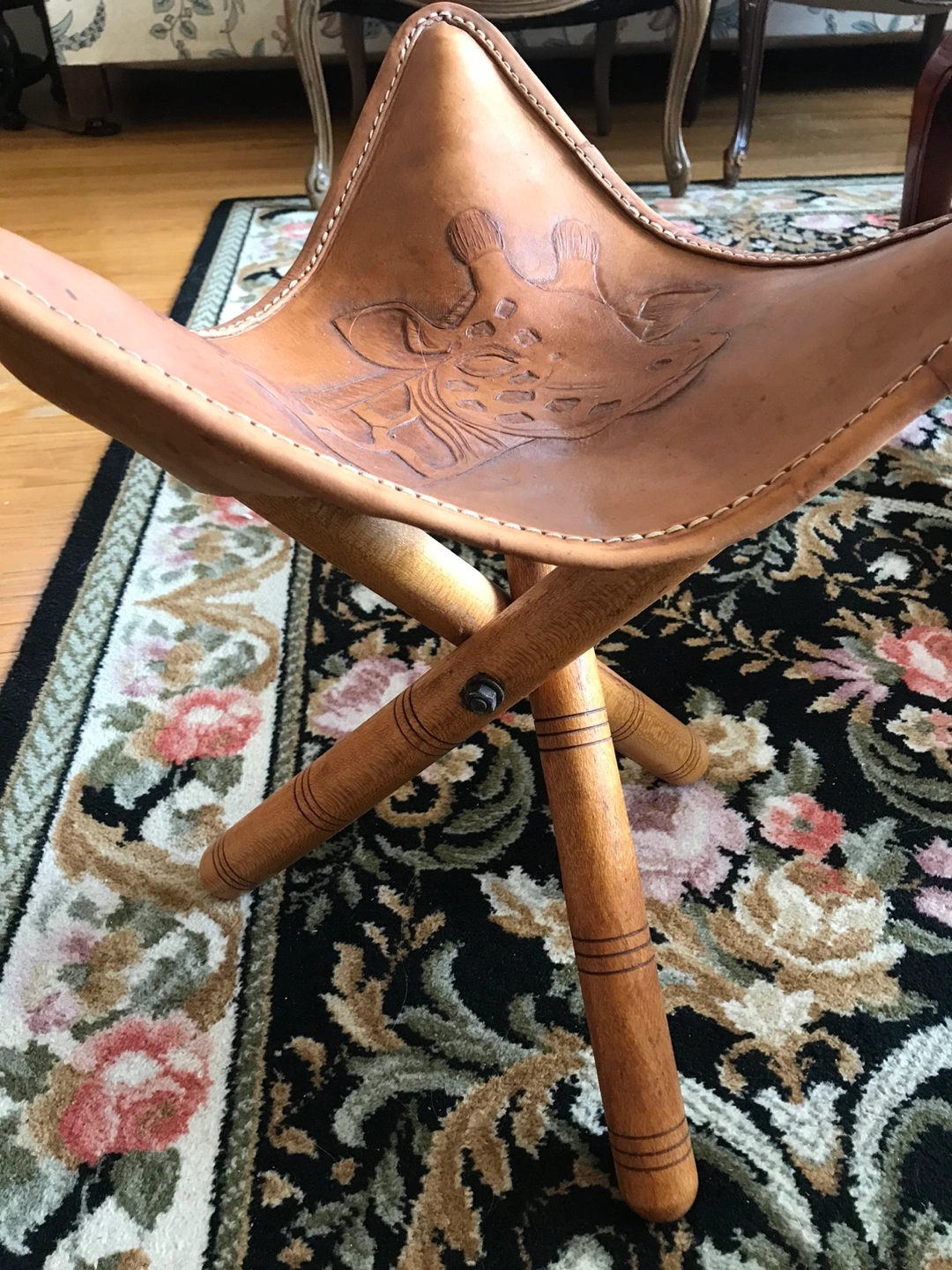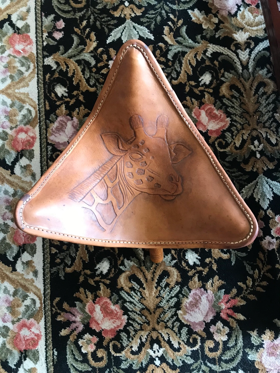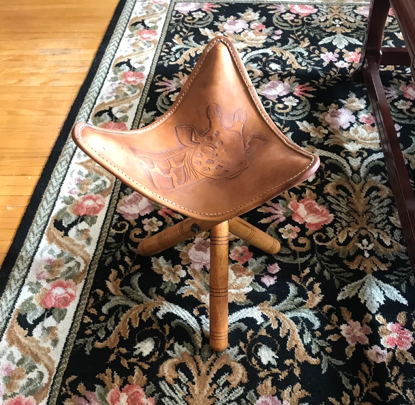 Unique vintage leather stool. Tooled leather. Tripod base. Features an embossed giraffe design on the seat. Lightweight and foldable. Could benefit from a good clean. Smoke free/pet free home. Yonge/Davisville pick up.