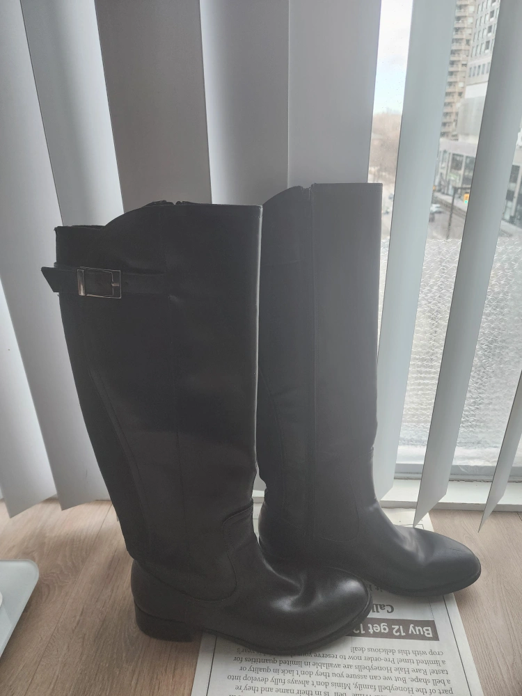 Pair of black leather knee-high boots. Side zipper closure. Good for fall and winter.