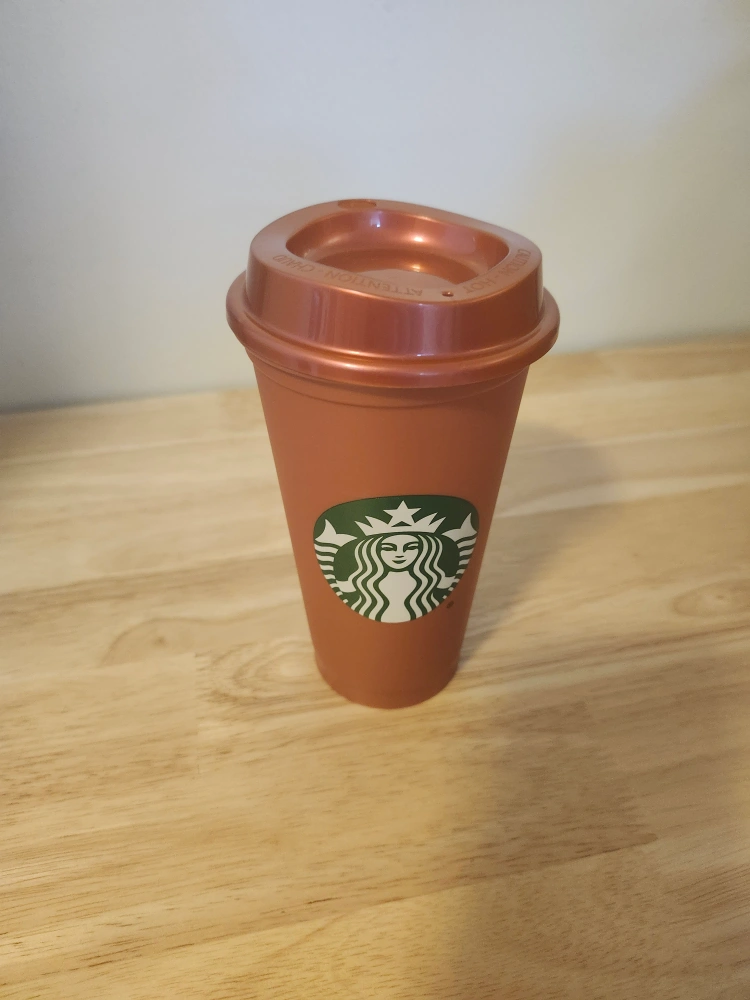 189Reusable coffee cup. Rose gold colour. Features Starbucks logo. Lid included.