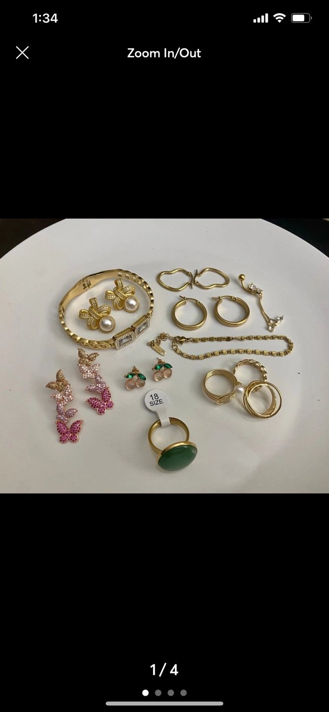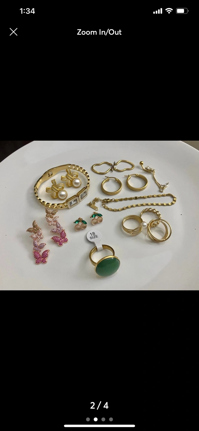 5 pairs of earrings, 2 bracelets, 1 belly ring, 4 rings, large green ring size US 8.