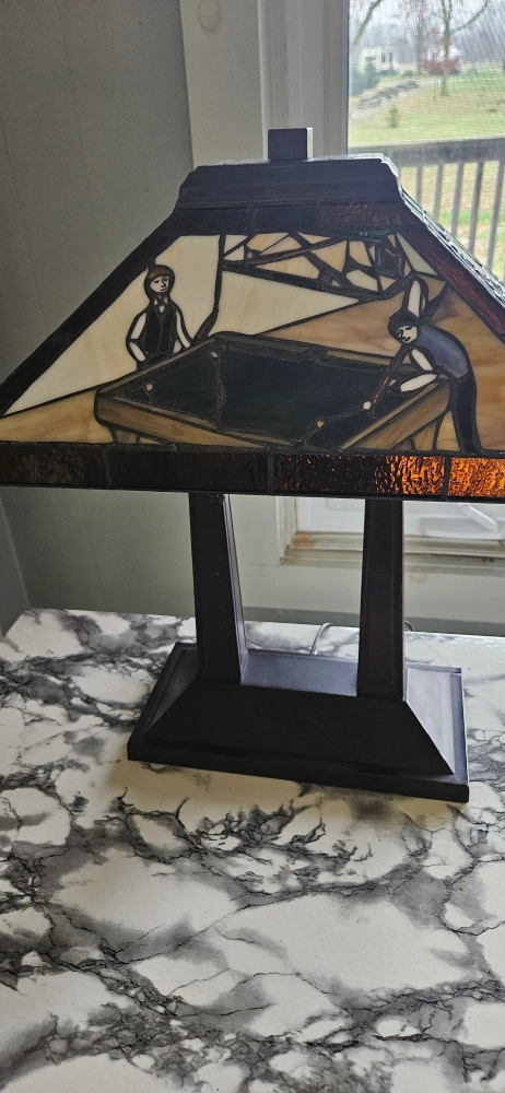 Beautiful stained glass lamp. Features a billiards scene. Dark brown wooden base. Perfect for a game room or man cave.