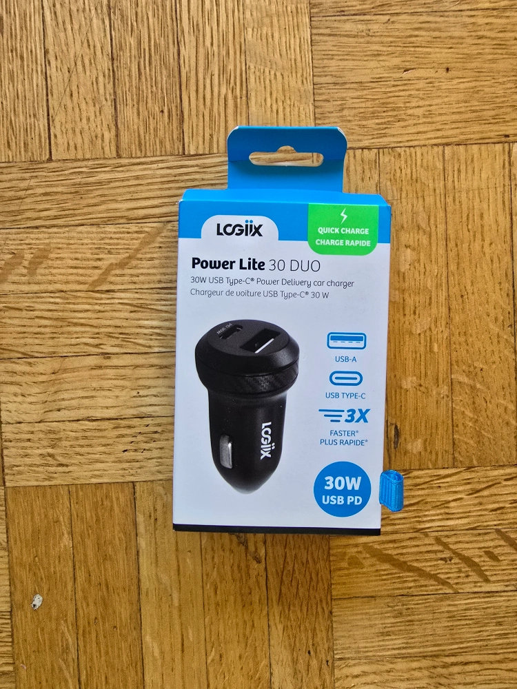 30W USB Type-C Power Delivery car charger. Features USB-A and USB-C ports. Quick charge capable.
