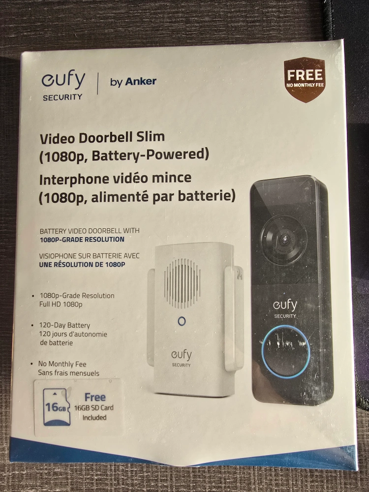 Eufy Wireless video doorbell. 1080p resolution. 120-day battery life. Includes 16GB SD card. No monthly fees.