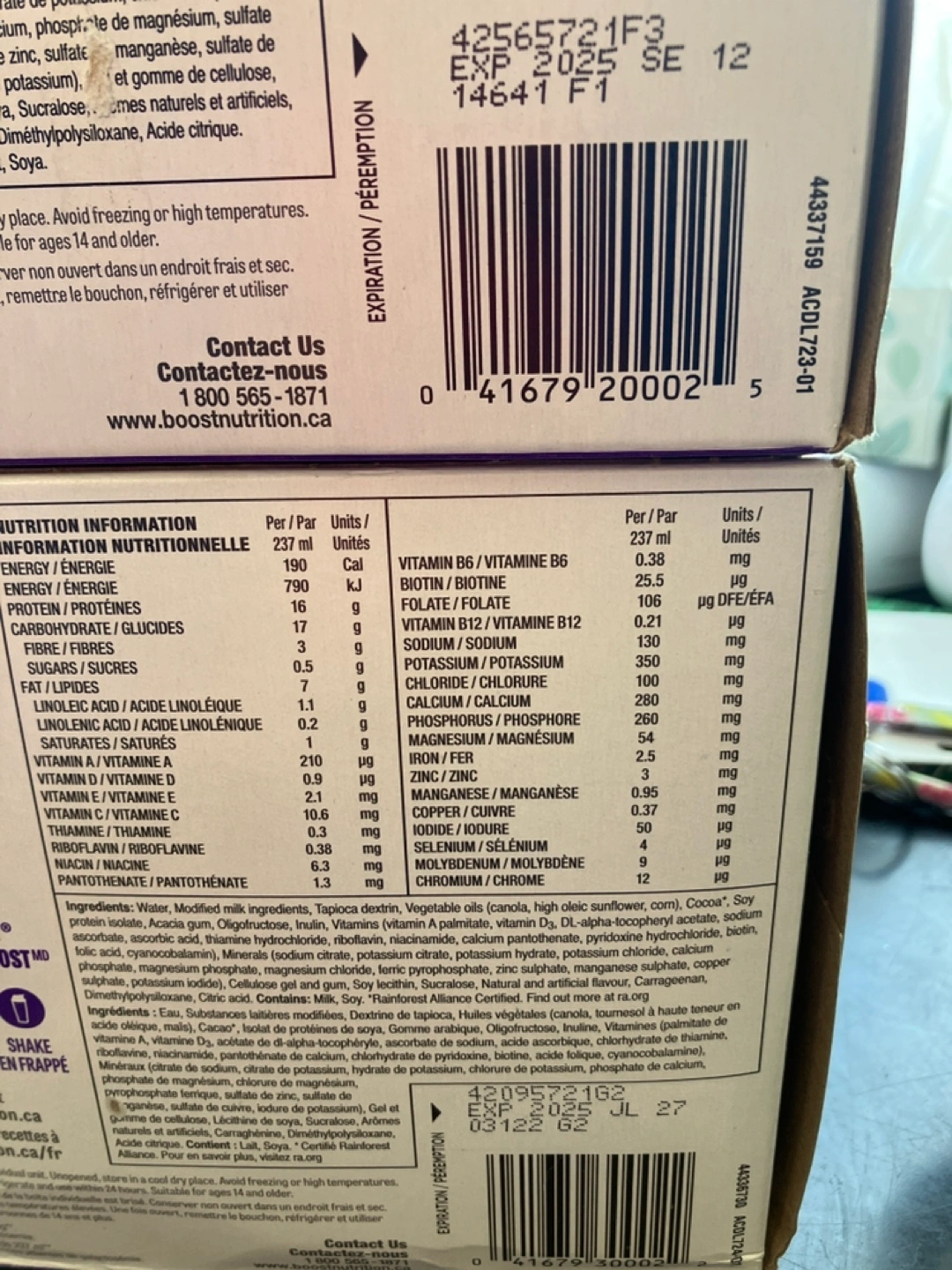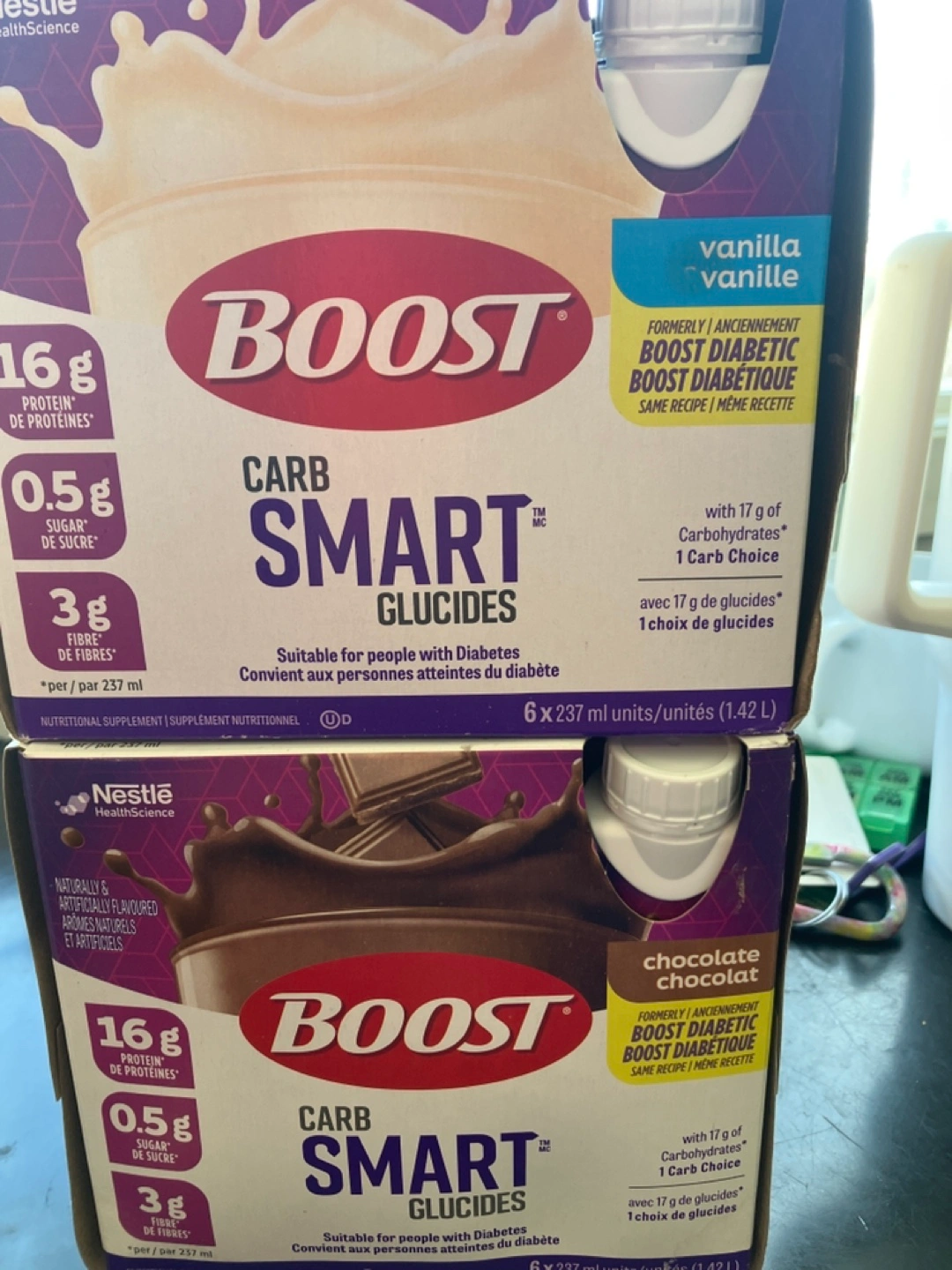 Six ready-to-drink bottles of Boost Carb Smart Glucides, 1 unopened box of vanilla and 1 unopened box of chocolate flavour. Suitable for people with diabetes. 237 ml bottles.