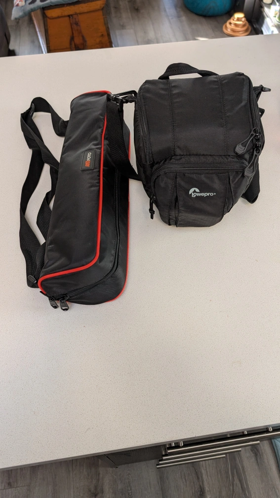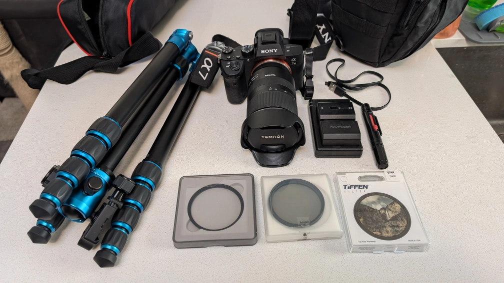 Tripod, filters, lens cover, and 3 total batteries with external 2 battery wall charger.