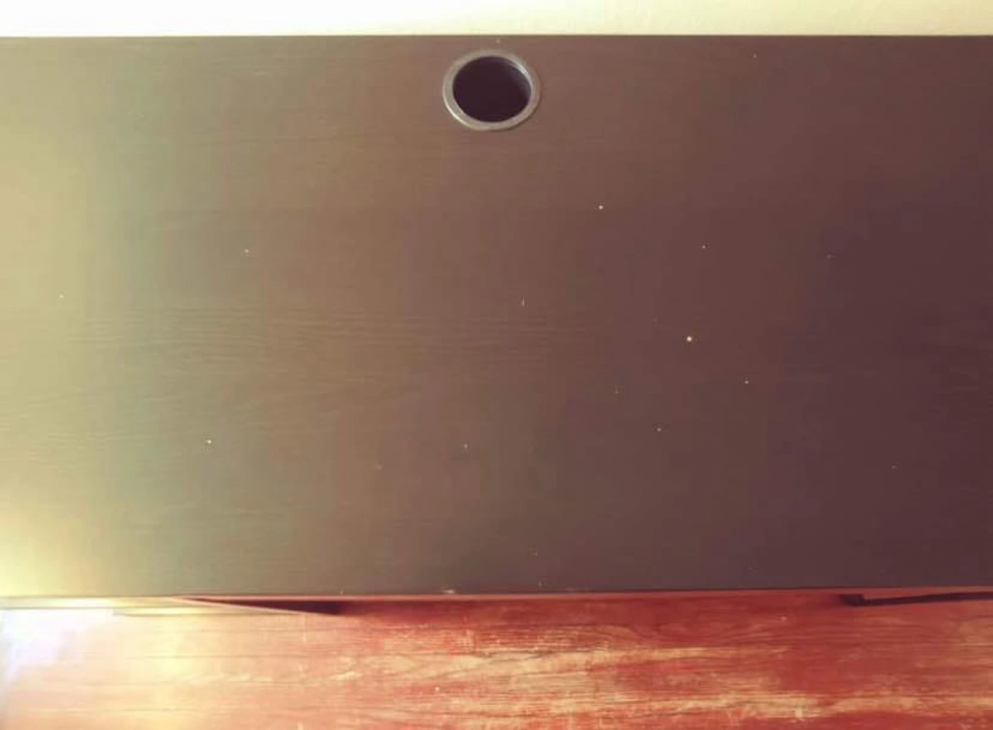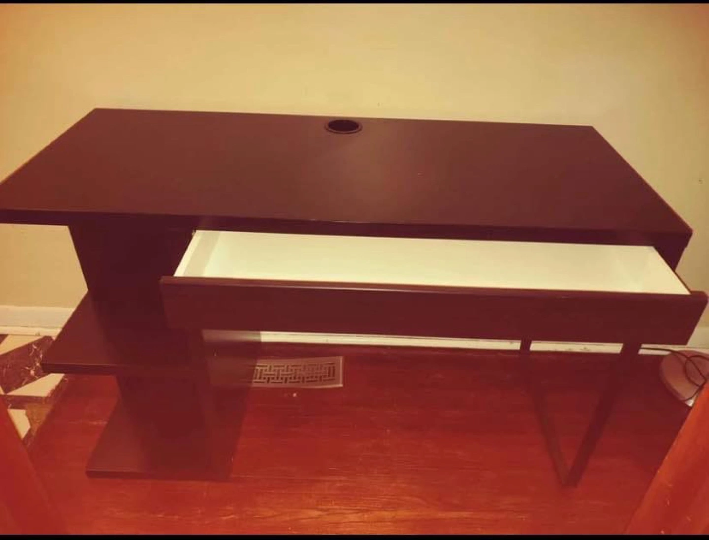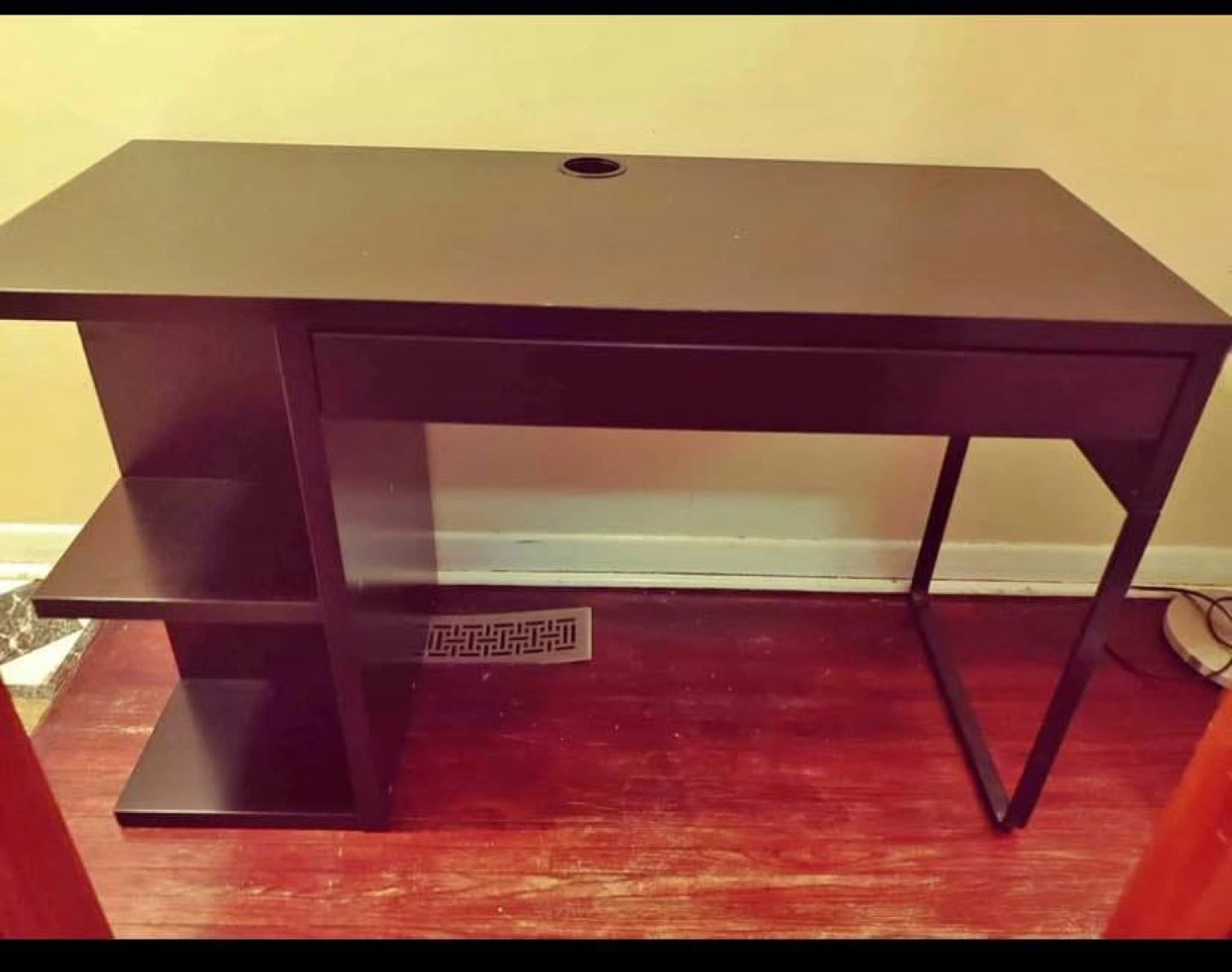 Long black computer desk. Features one drawer and open shelving. Cable management hole in desktop. Good for small spaces.