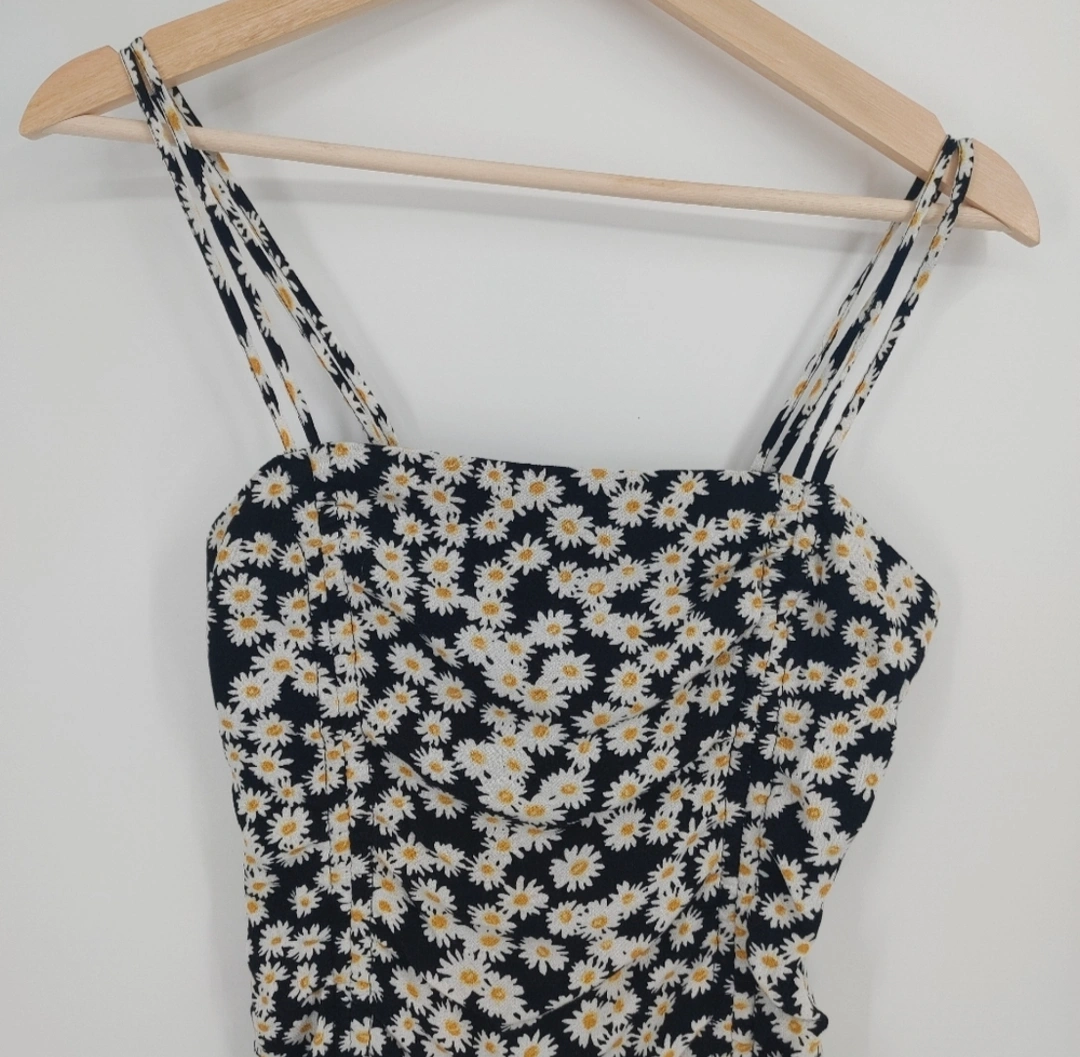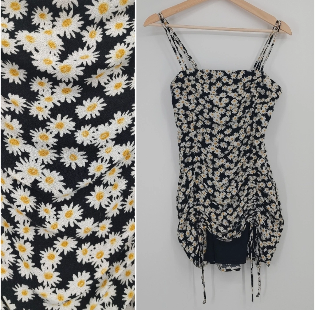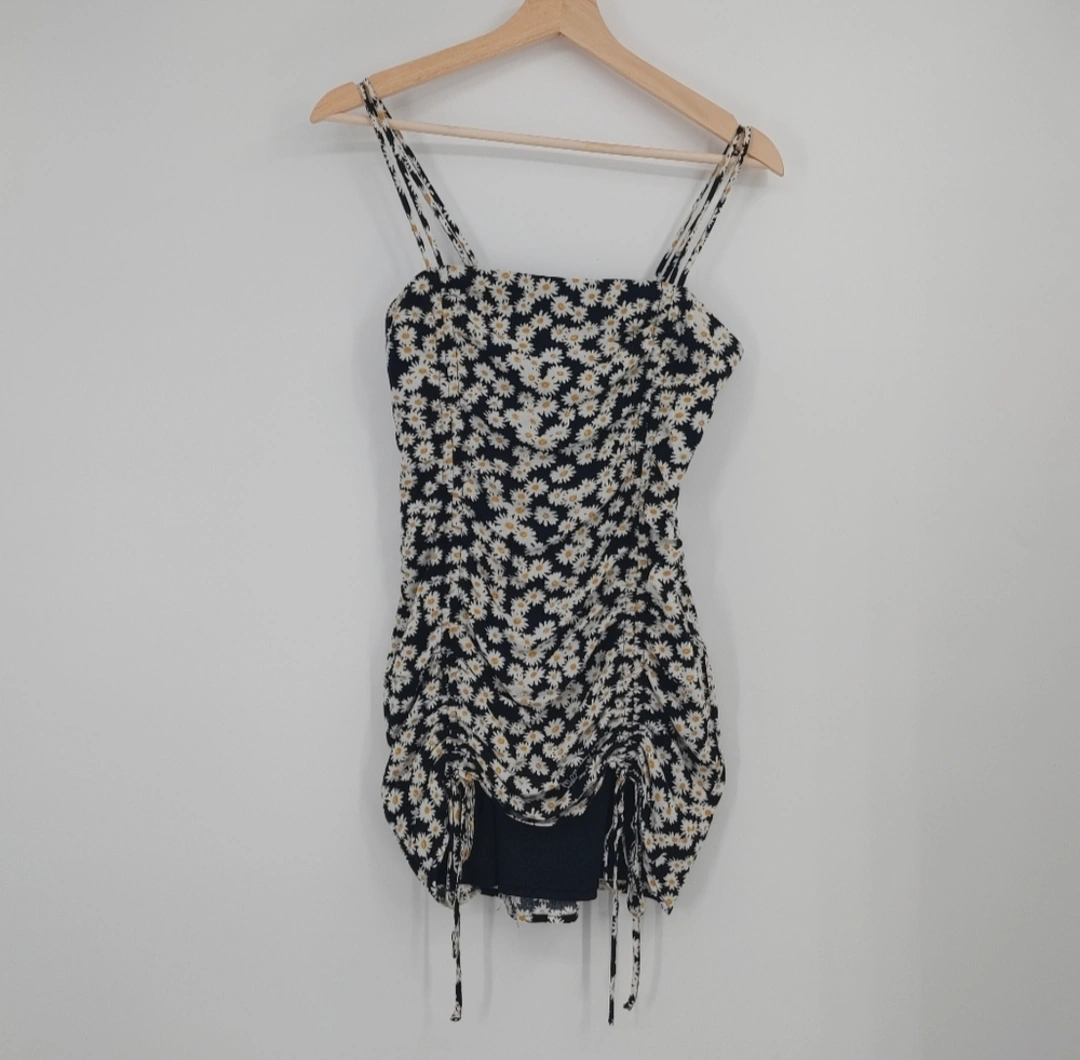 Cute mini dress. Features a black background with a white and yellow daisy print. Adjustable straps. Adjustable length with drawstrings. Cinched waist. Perfect for summer.