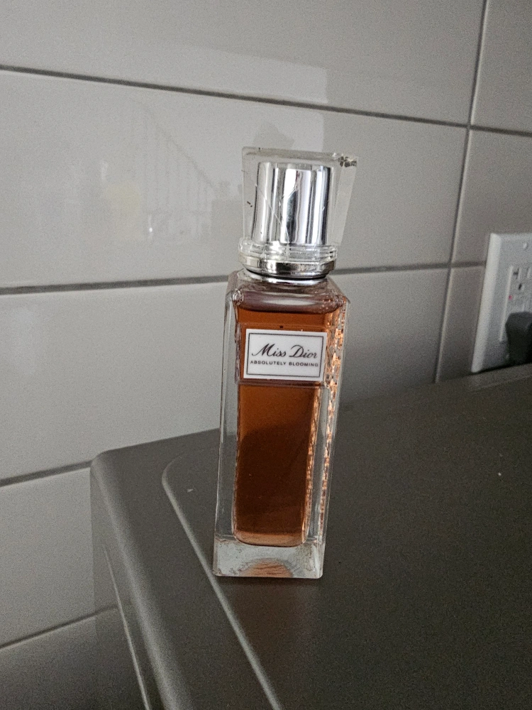 Small bottle of Miss Dior Absolutely Blooming perfume. Amber coloured liquid. Silver cap. full bottle Authentic!!! Roller