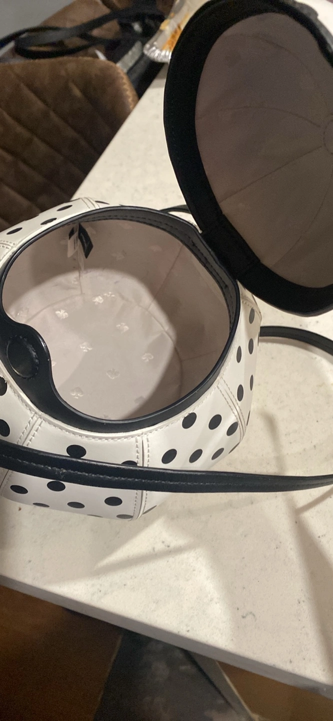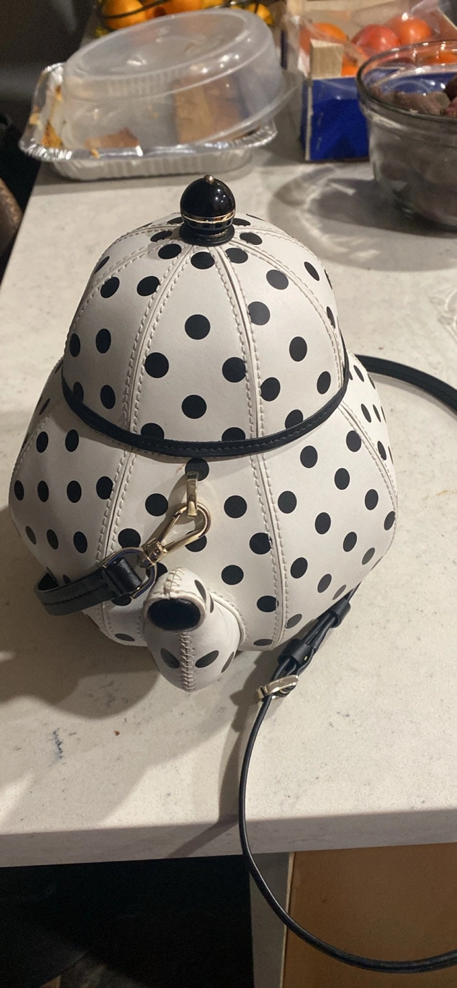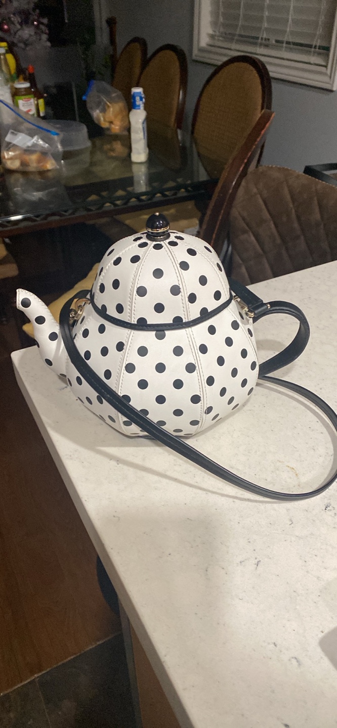 Unique teapot-shaped crossbody bag. Polka dot pattern. Black and white. Leather-like material. Adjustable strap. Pre-owned.