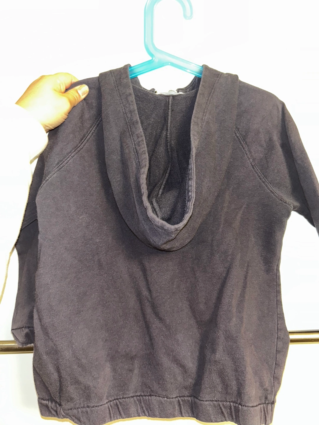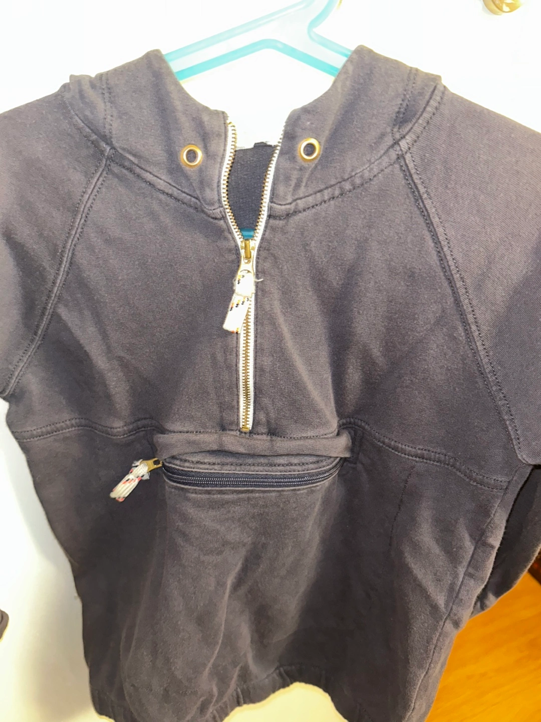 Blue grey hooded sweatshirt. Half zip closure. Kangaroo pocket. Size 6/7. 3/4 length sleeves.