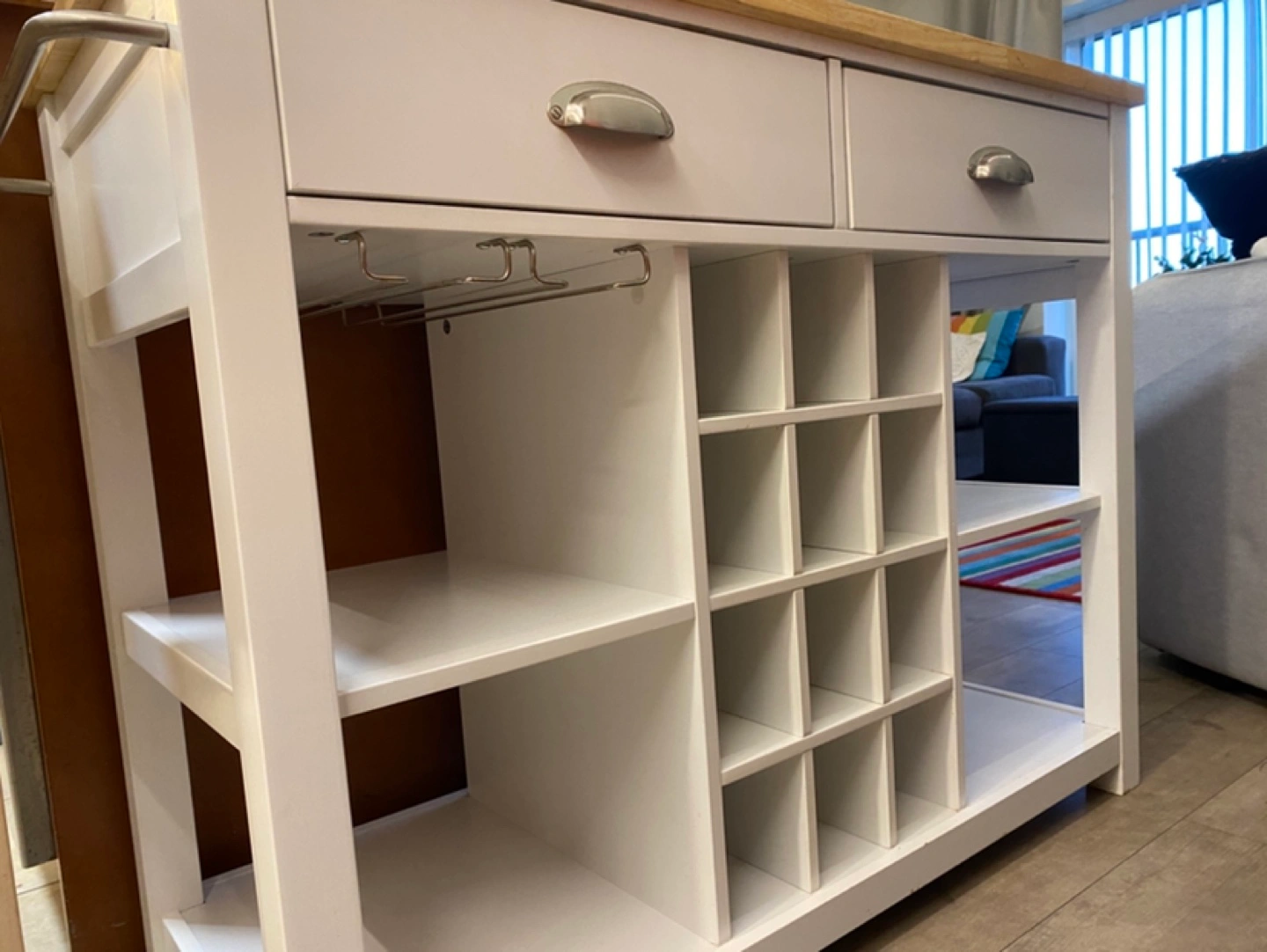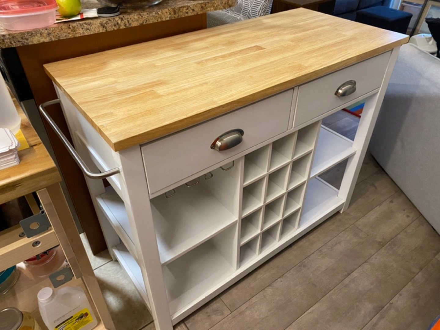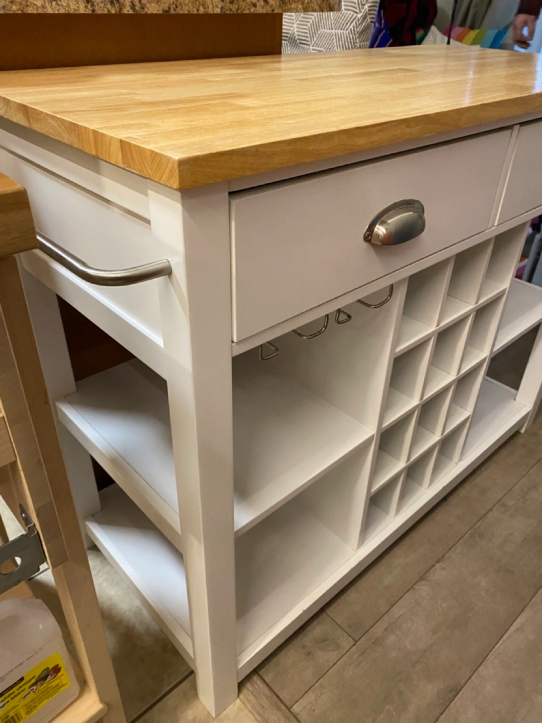 Kitchen island features butcher block countertop, two drawers, metal wine glass hangers, twelve cubbies measuring 3 3/4” by 5”; perfect for your wine bottles!