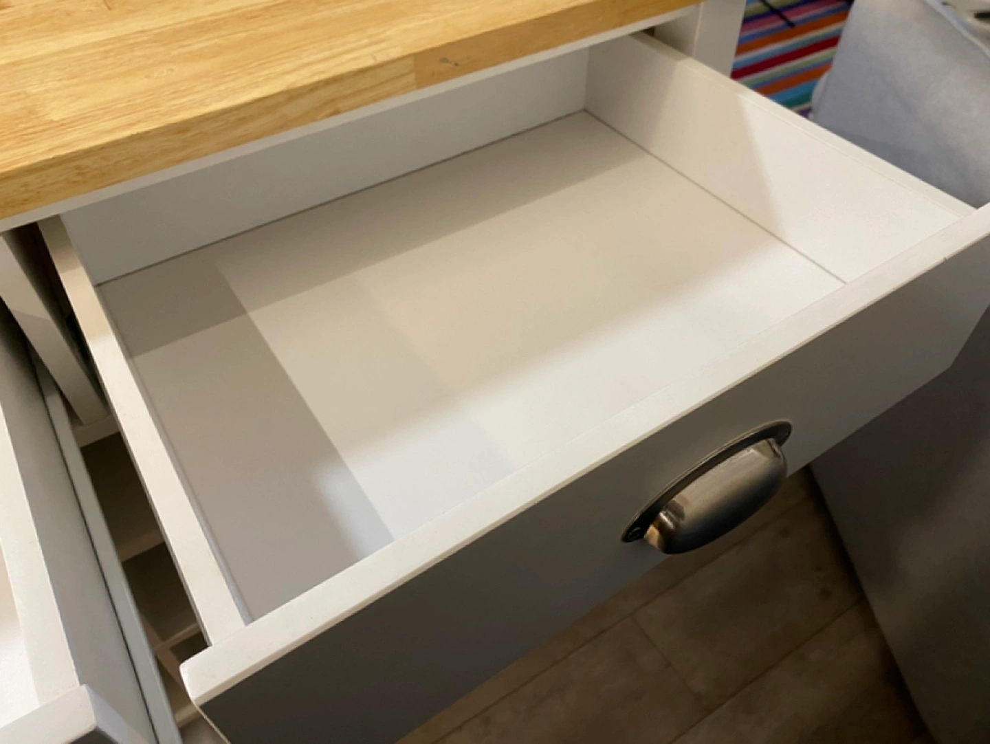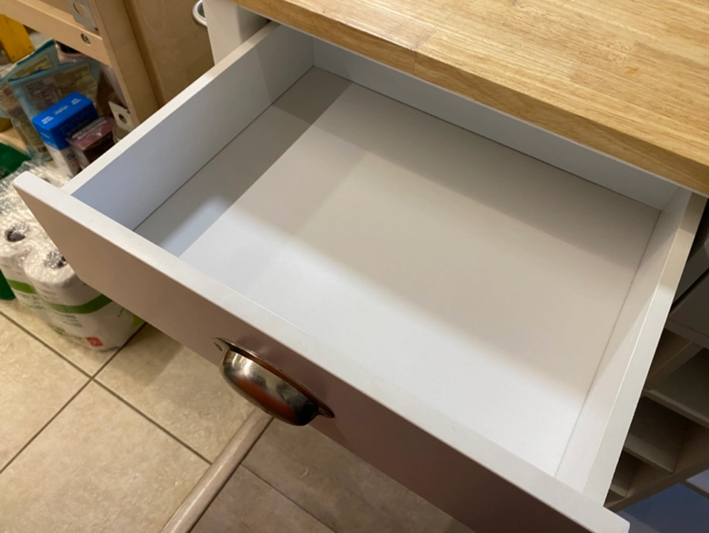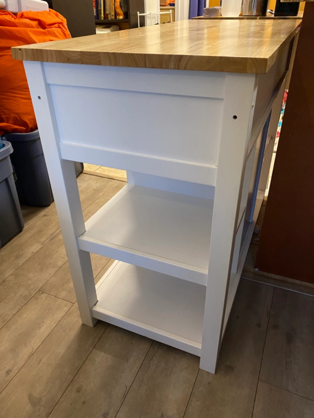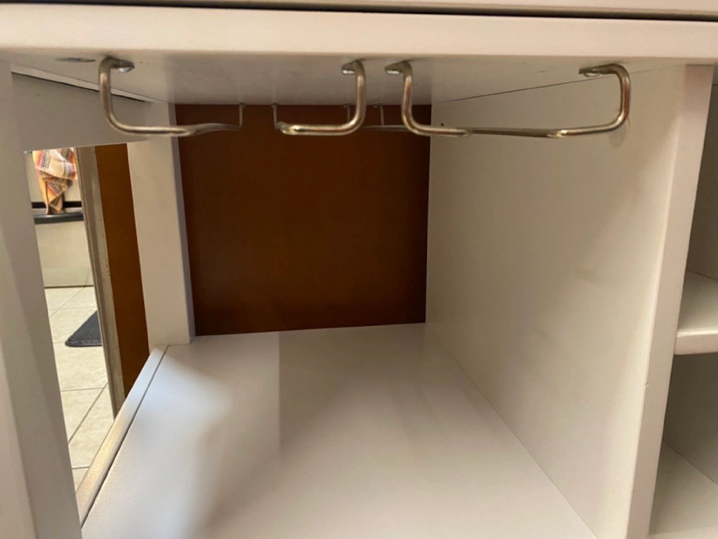 Kitchen island features butcher block countertop, two drawers, metal wine glass hangers, twelve cubbies measuring 3 3/4” by 5”; perfect for your wine bottles!